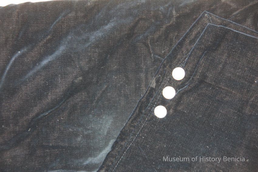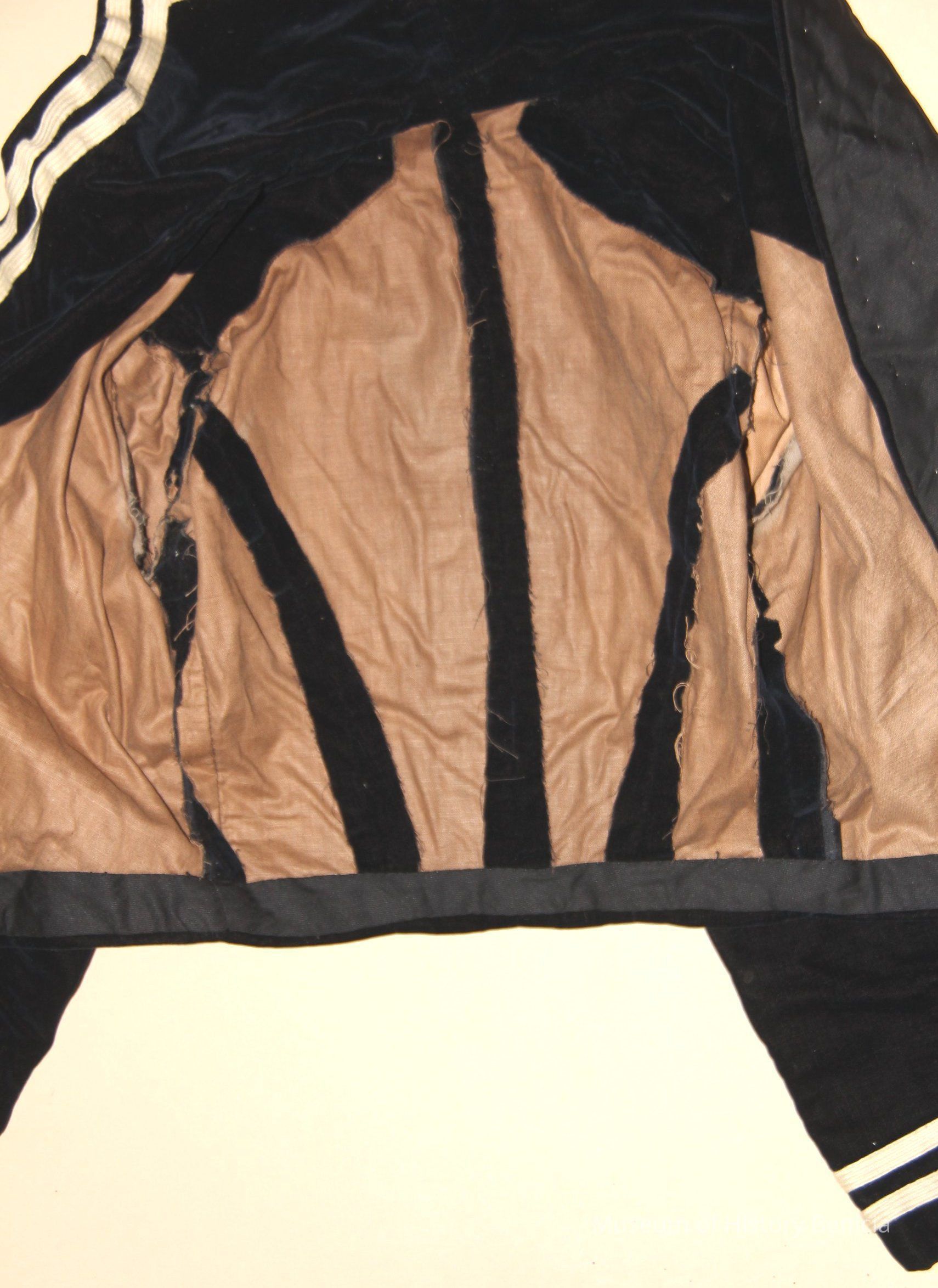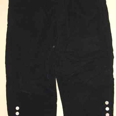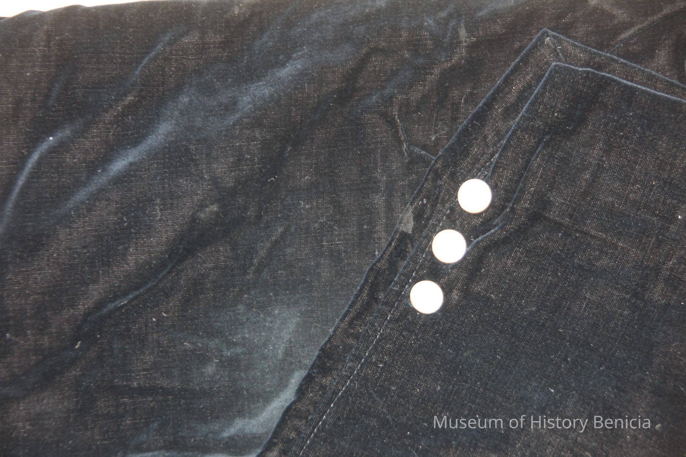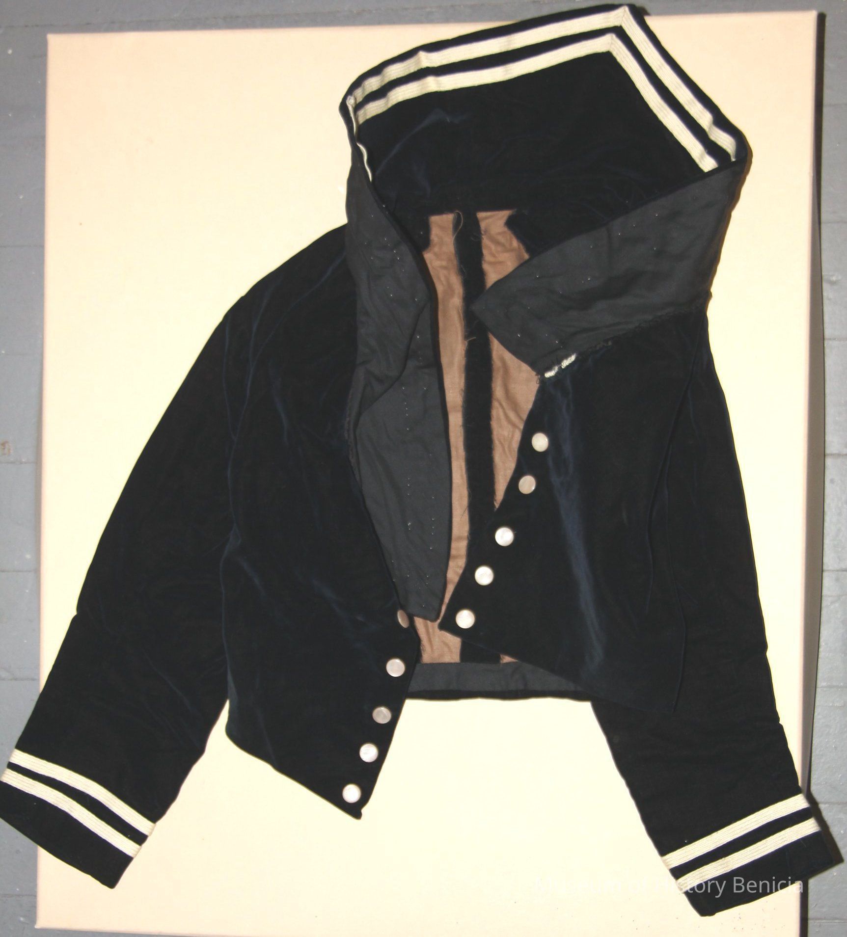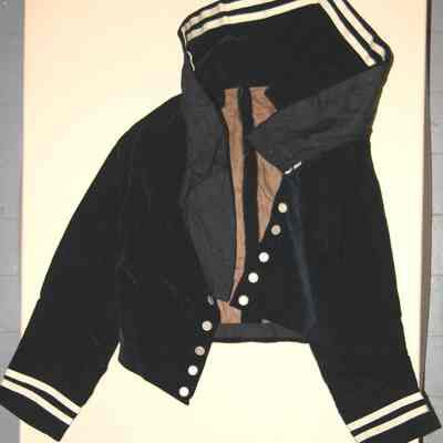Little boy's black velvet suit (a - jacket, b-- pants) with off-white trim and buttons. Hand and machine stitched. ca. 1920.