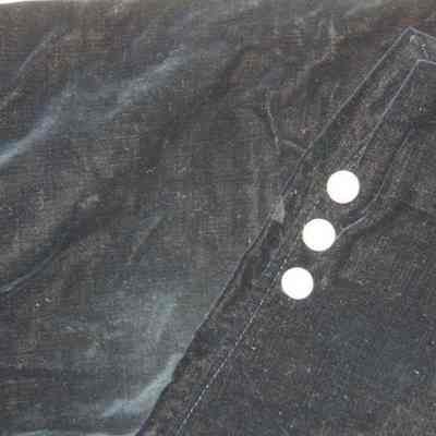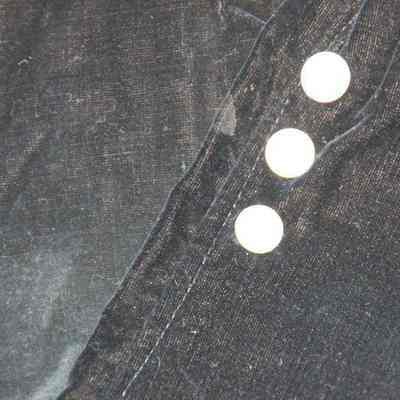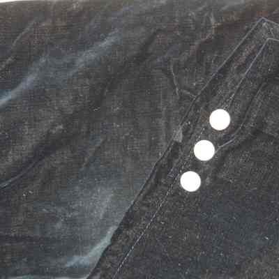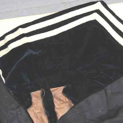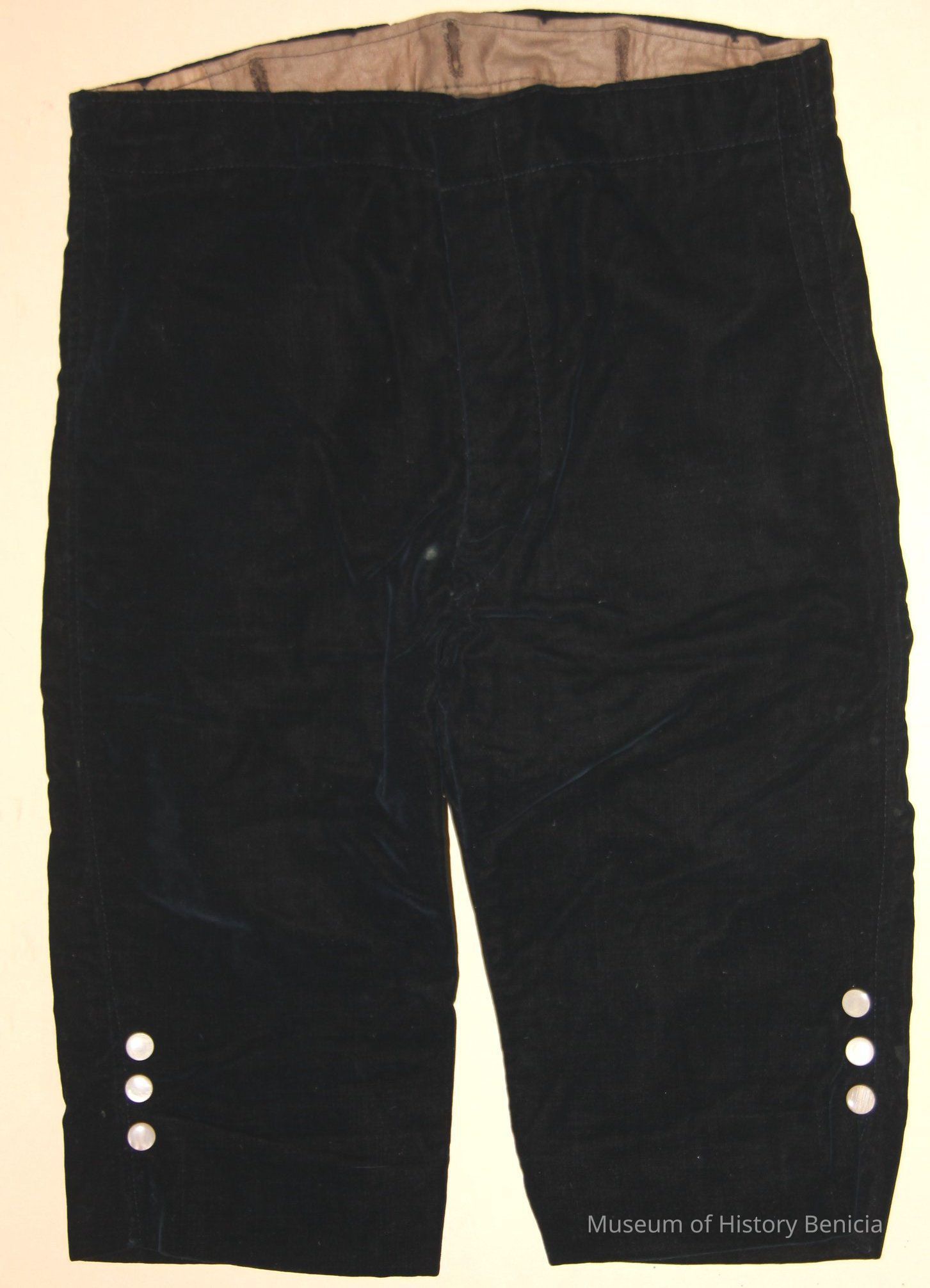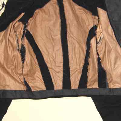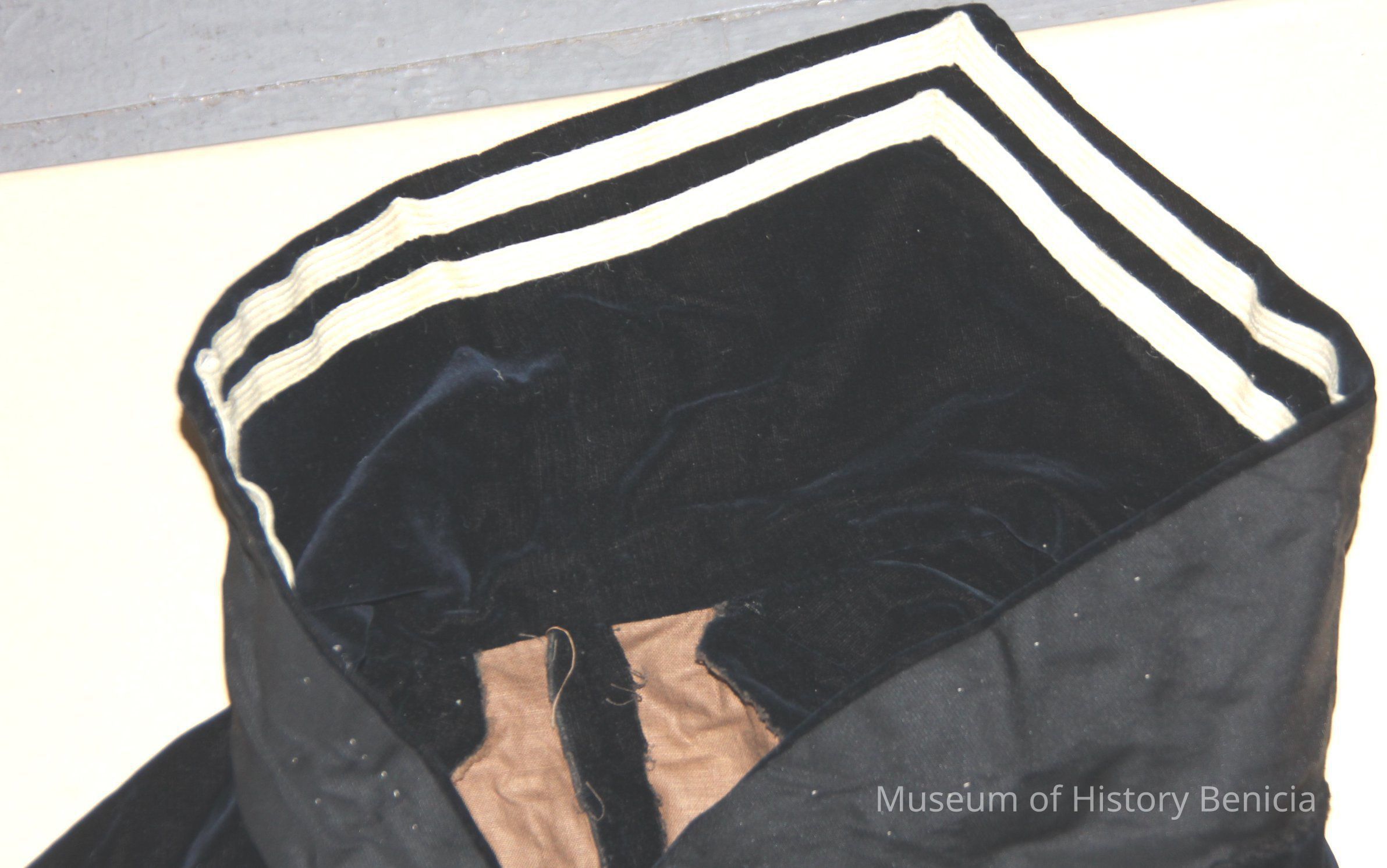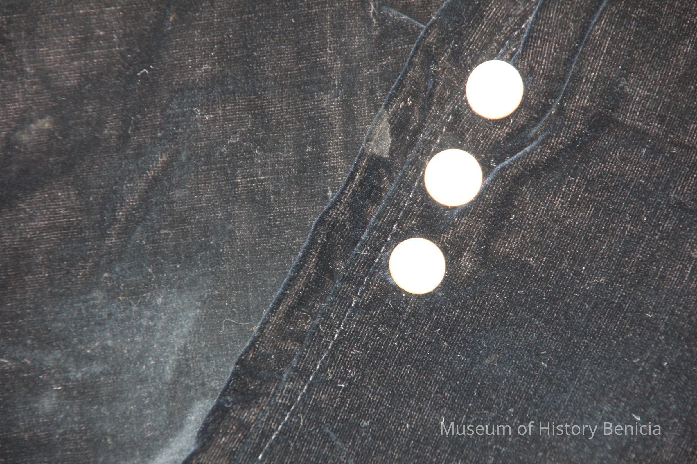 Little boy's black velvet suit (a - jacket, b-- pants) with off-white trim and buttons. Hand and machine stitched. ca. 1920.