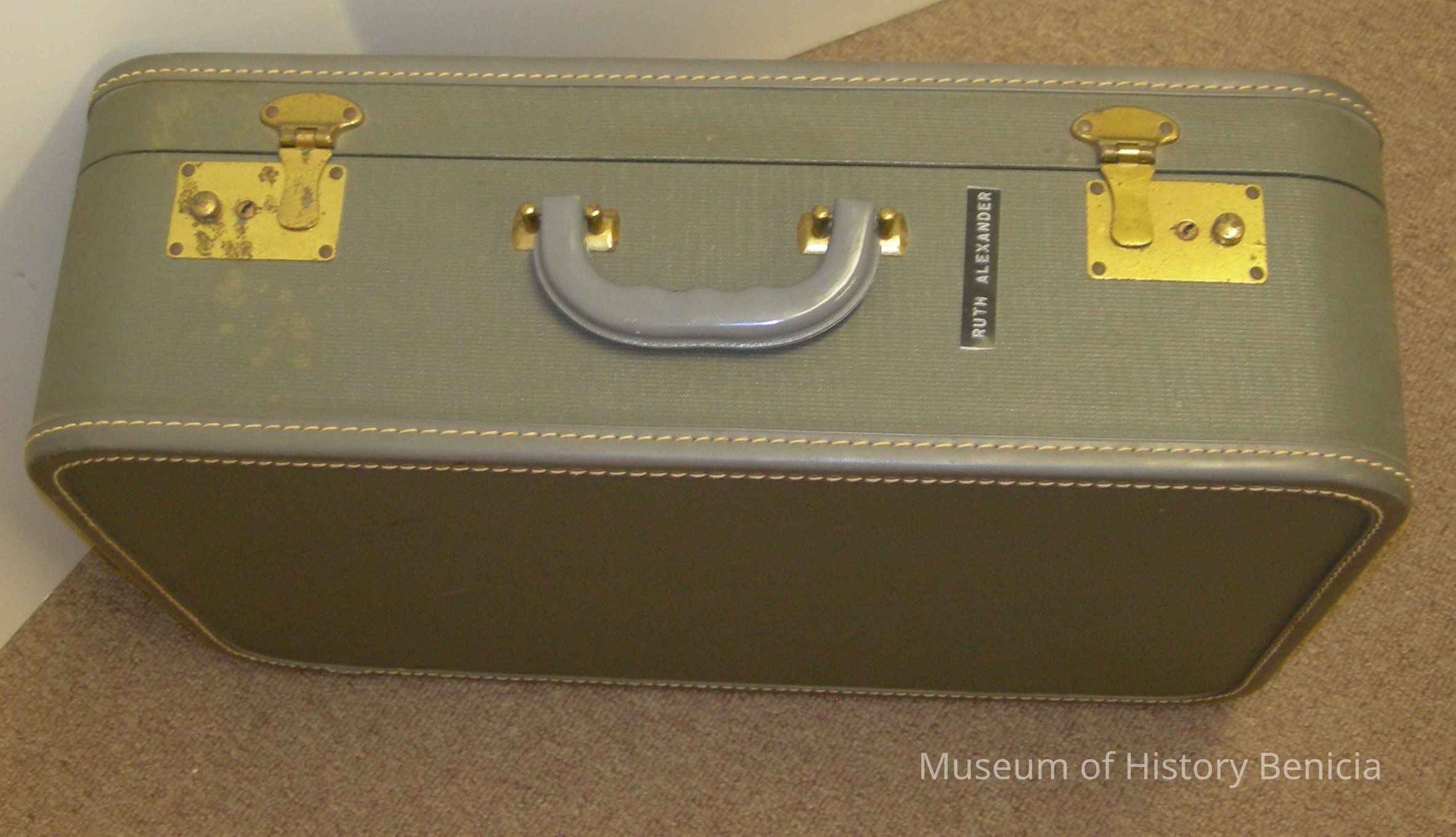 grey, hard-body suitcase which belonged to Ruth Alexander (her name is on it with a plastic "label-maker" label); satin/nylon lining with pockets insideCollection