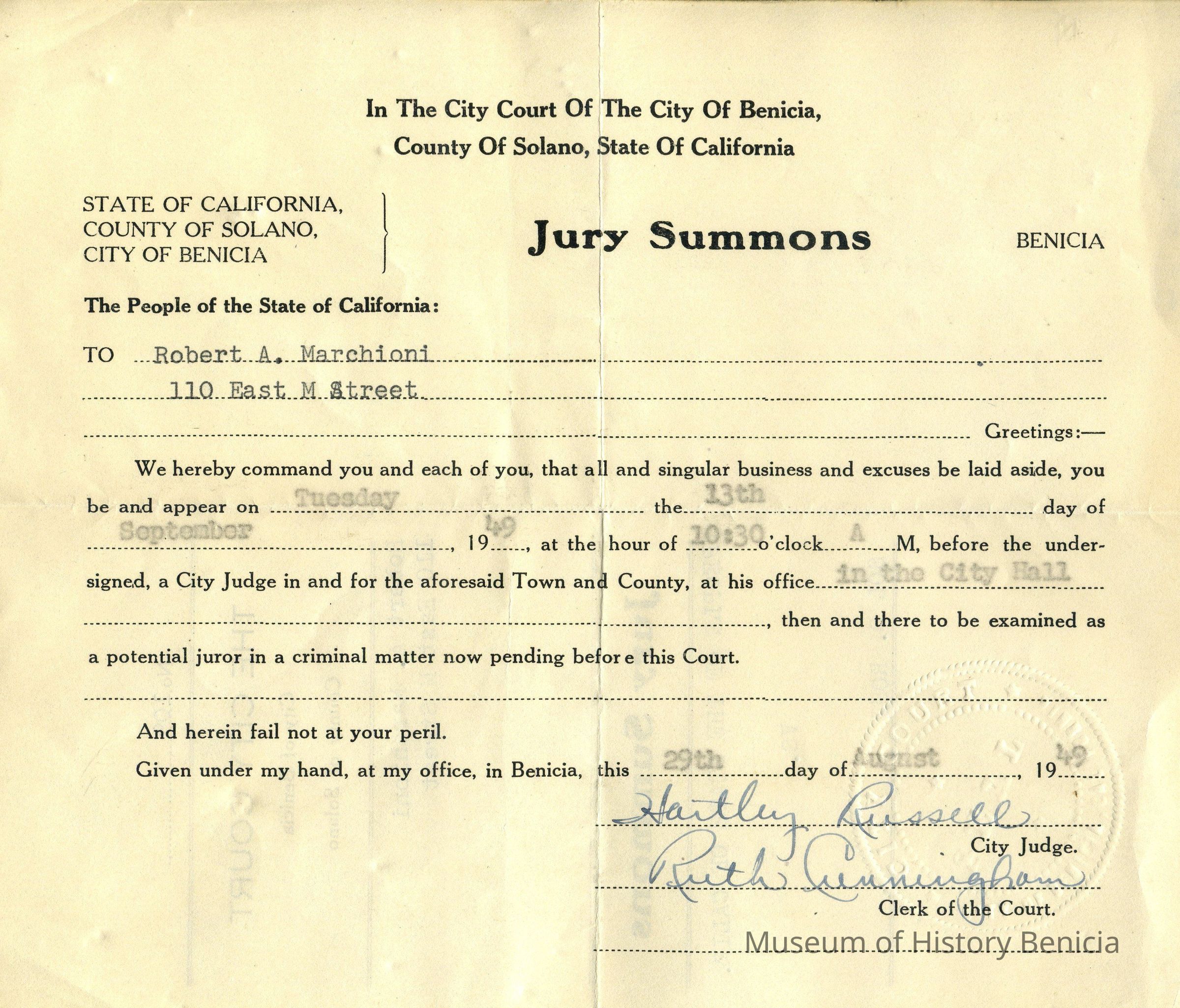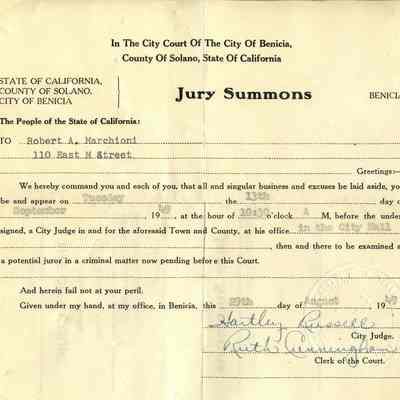 Jury Summons to Robert A. Marchioni to appear on Tuesday the 13th day of September 1949 at 10:30 am at City Hall to be examined as a potential juror in a criminal matter pending before the Court.