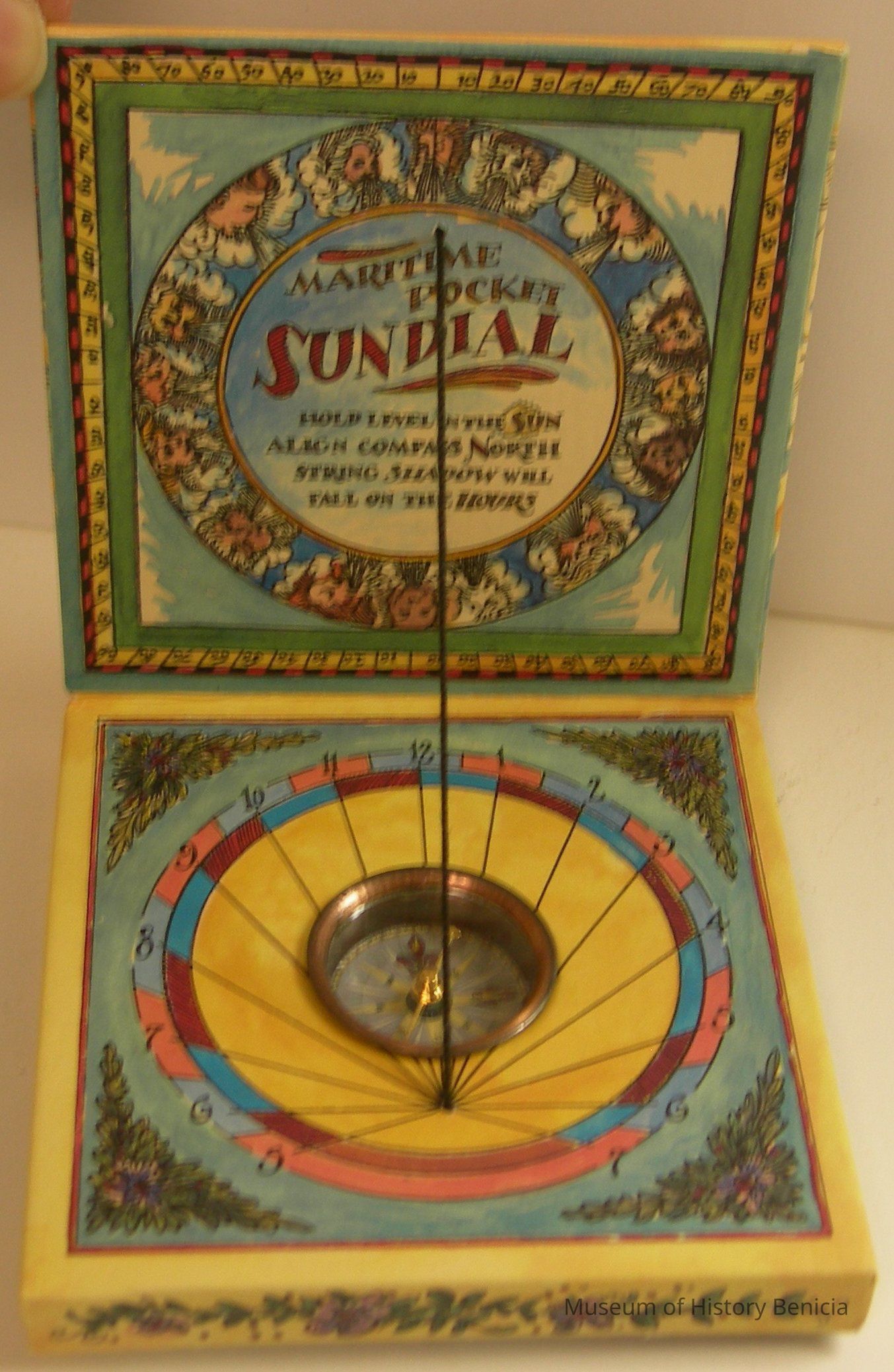 On inside of lid: "Maritime Pocket Sundial - Hold level in the Sun - align compass North -