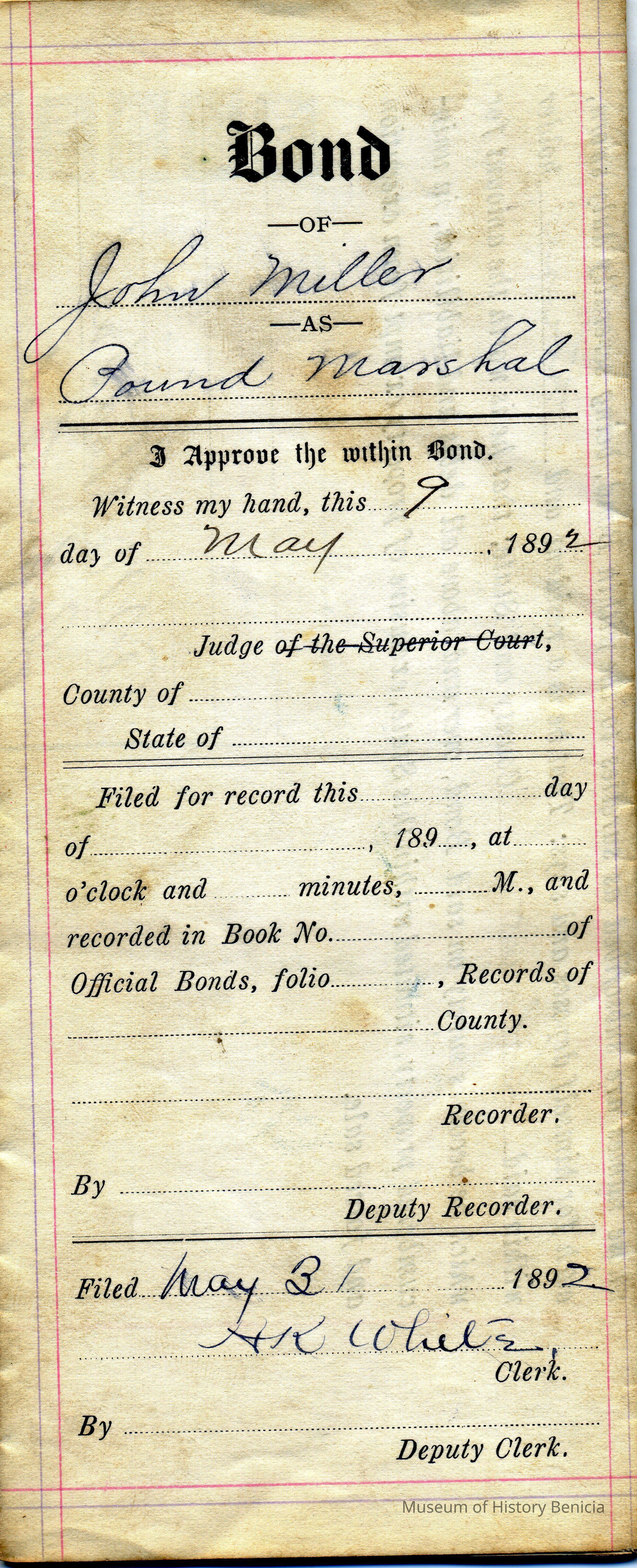 This is a bond surety for John Miller, A.M. Stoddard and John Coleman for $200 as Pound Marshall of Benicia on 05/09/1892.