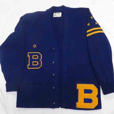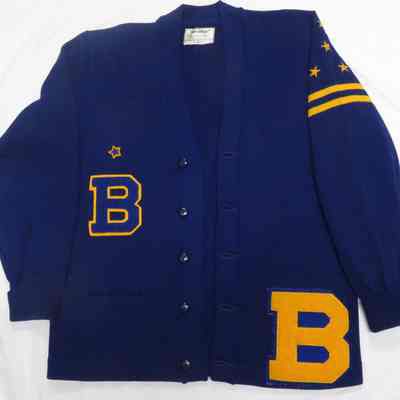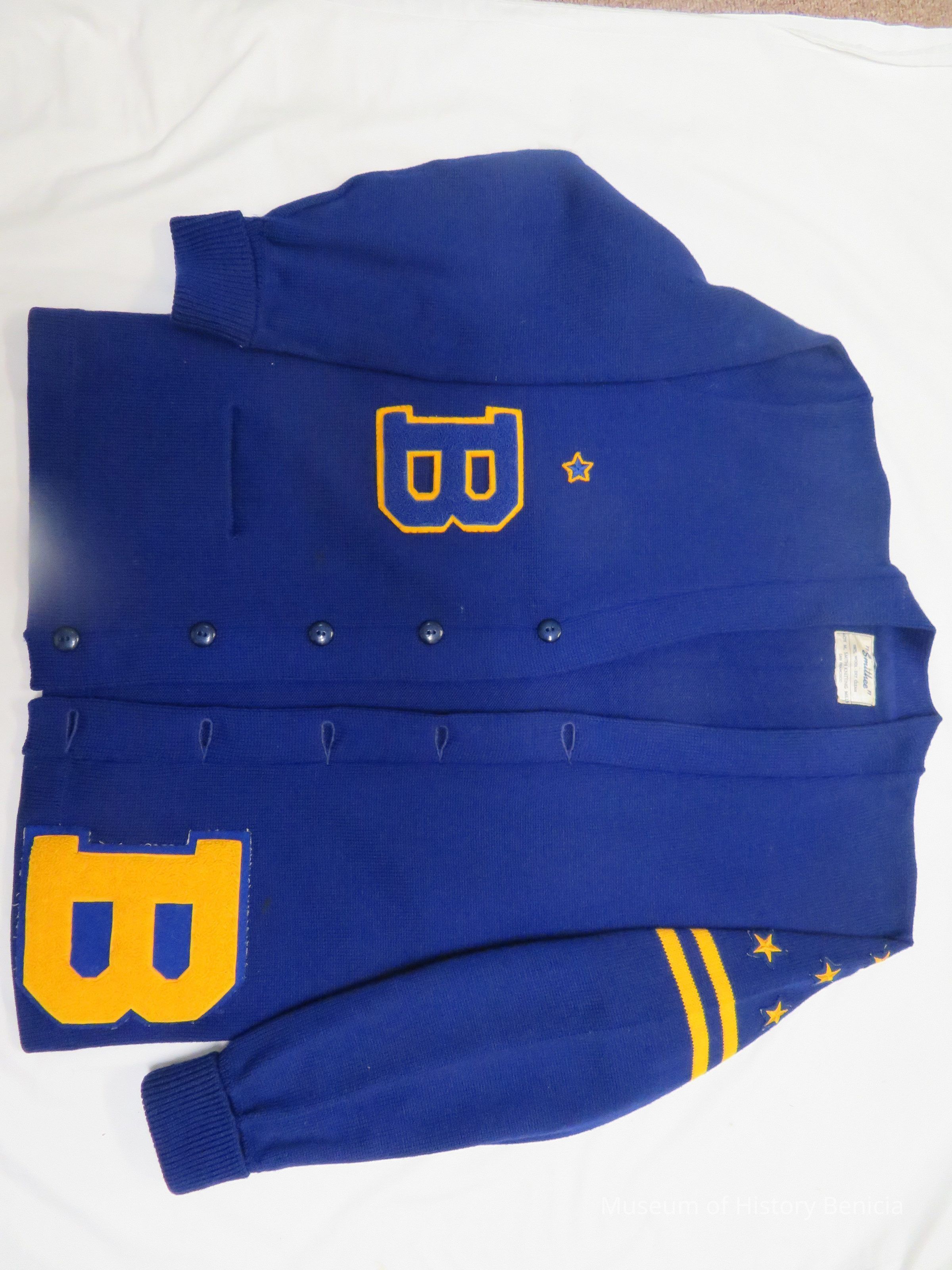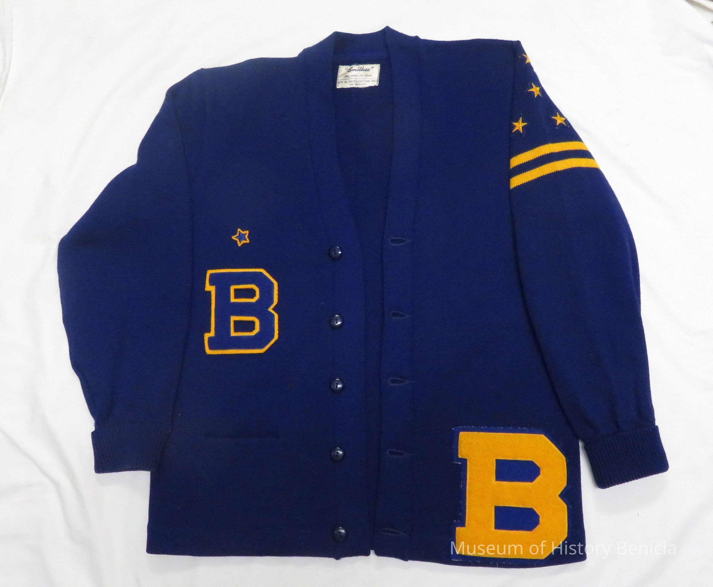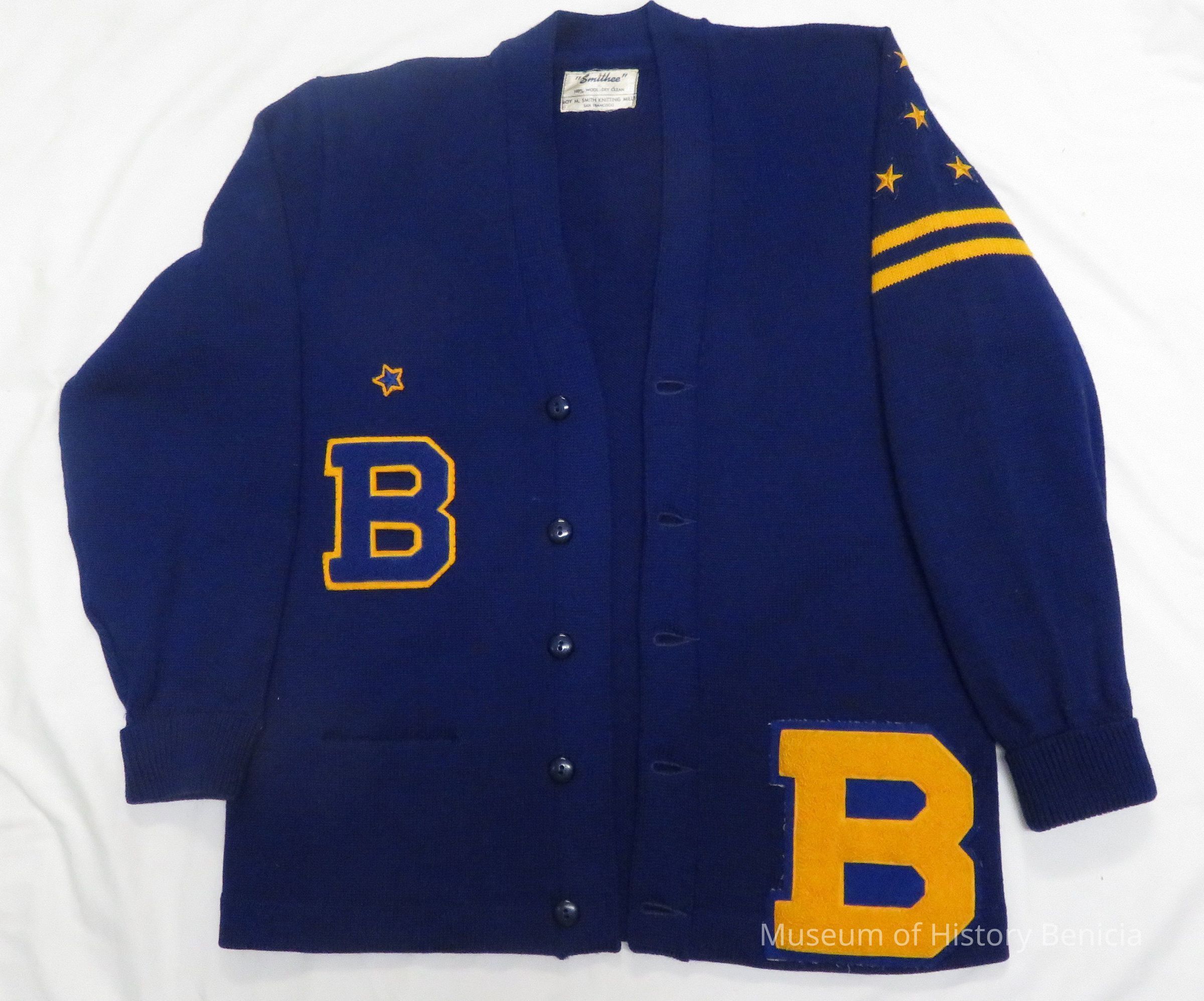 Letterman's sweater (high school), blue with gold lettering and stars with stripes on left sleeve. Patch pockets, on front. Label: "Smithee" 100% wool, dry clean - Made by Roy M. Smith Knitting Mills, S.F. Size large. Small B is JV letter. Large B is varsity. 4 varsity stars and 1 JV star. Sweater buttons in front. Sweater belonged to Charles Wingert Benicia High School class of 1966.Collection