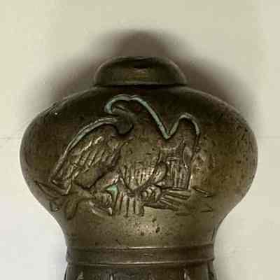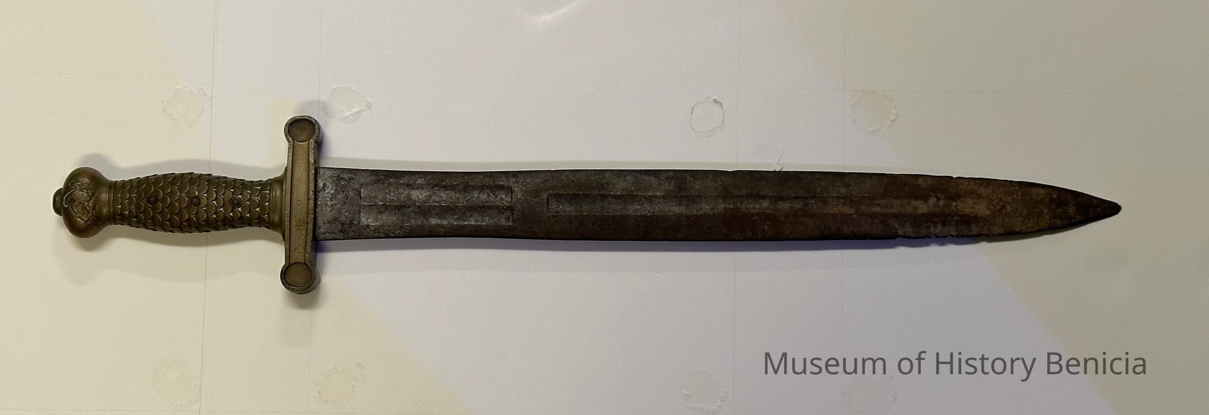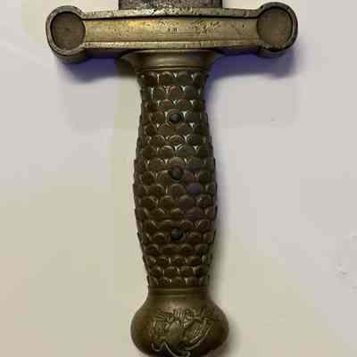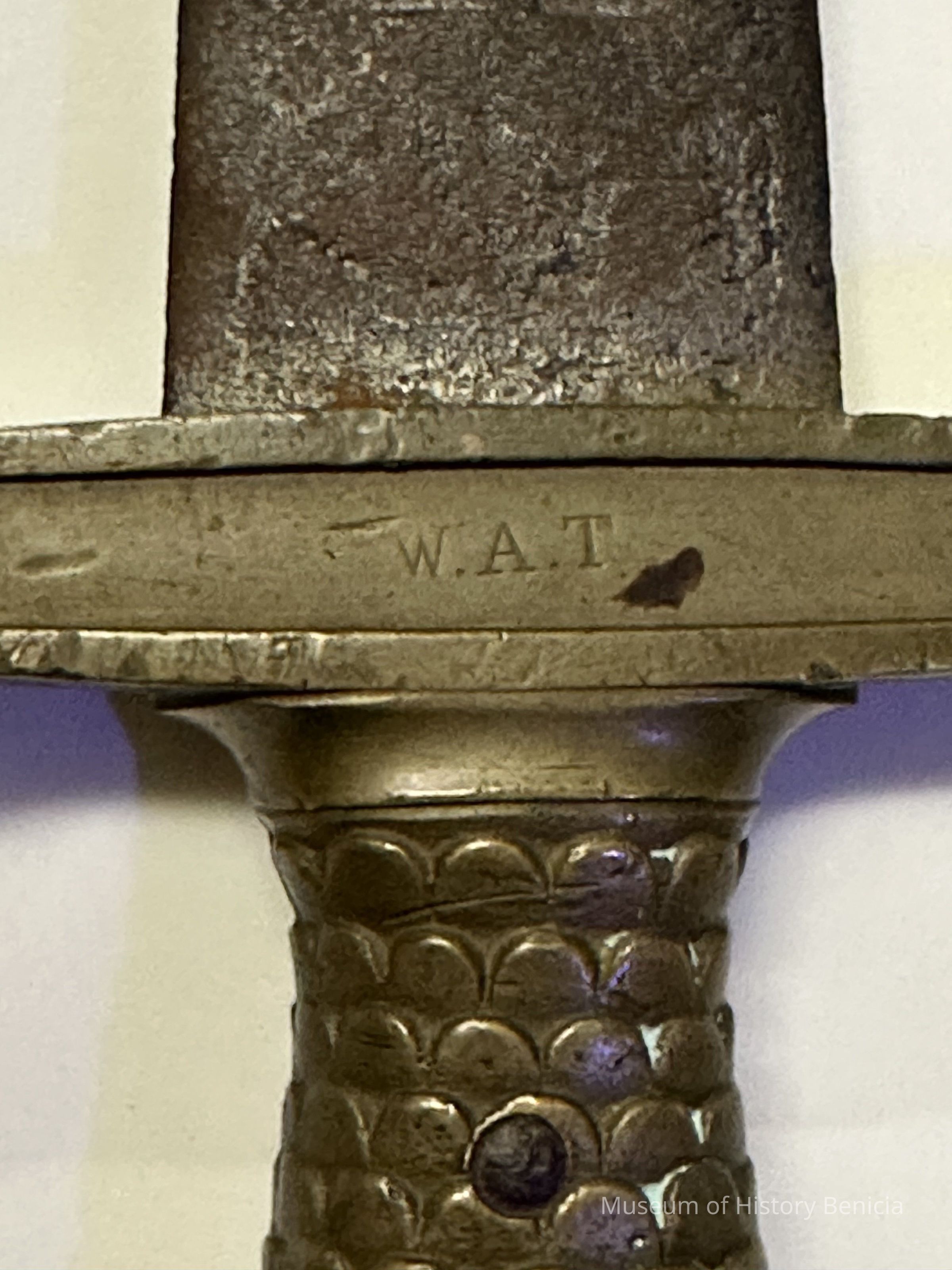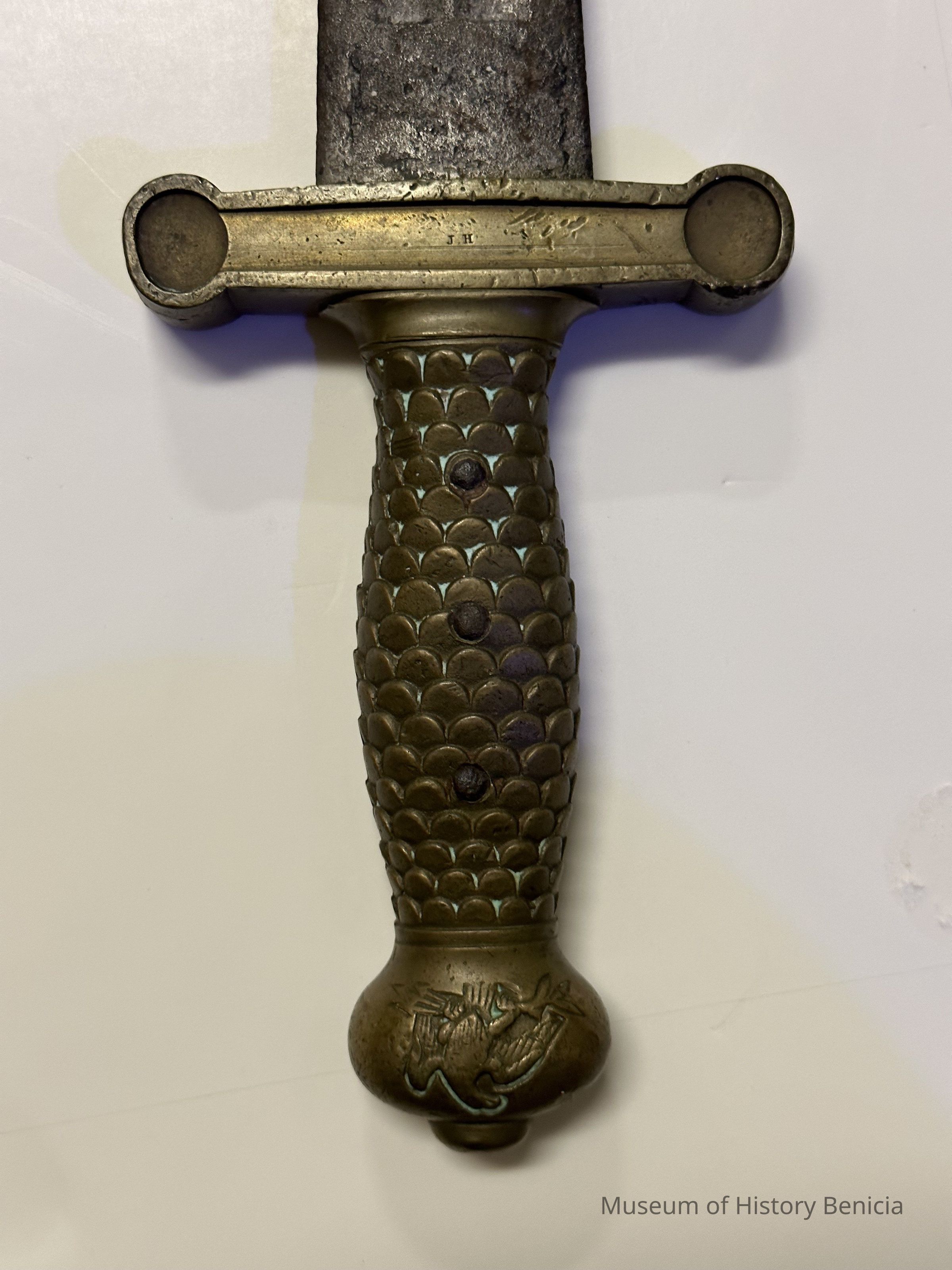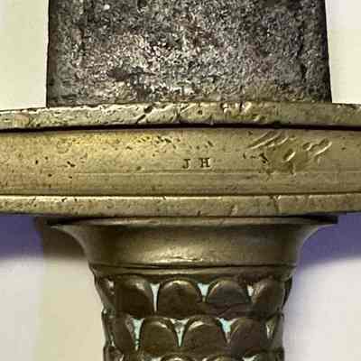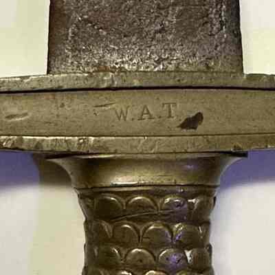 U.S. Model 1832 foot artillery short-sword with a 6-inch solid brass hilt, a 4-inch crossguard, and a double-edge steel blade 19 inches in length. Eagle cast into handle end. Initials J,H on crossguard one side, W A T on other.
