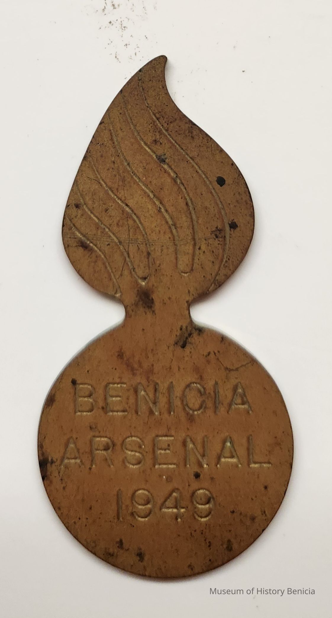Brass piece in the shape of an ordnance symbol. Etched on front: "Benicia Arsenal 1949" and lines on the "flame" to indicate fire.