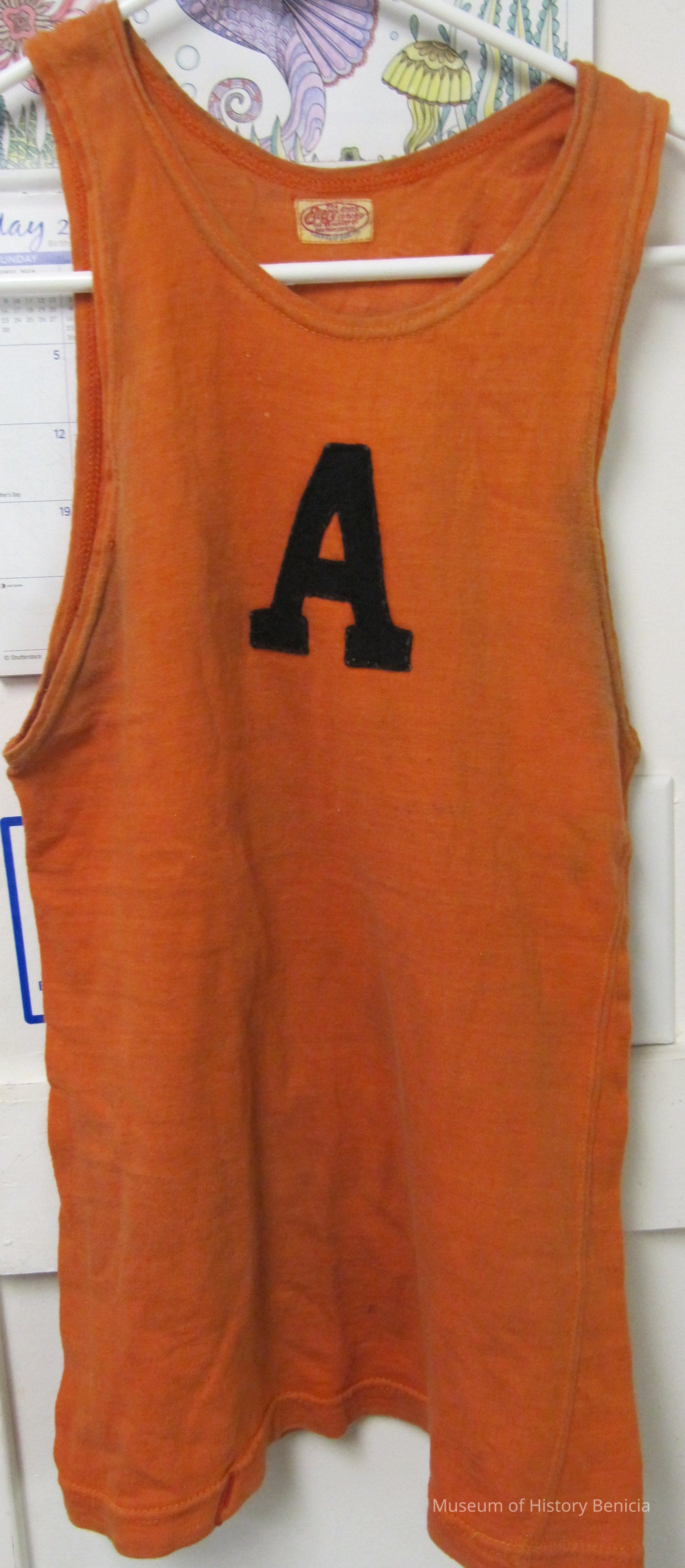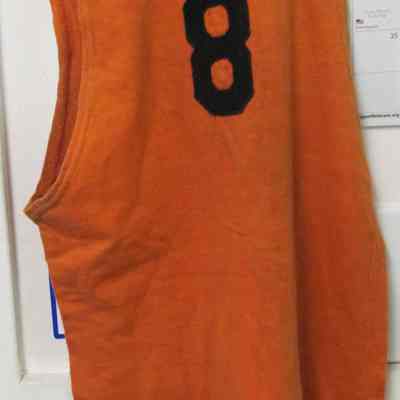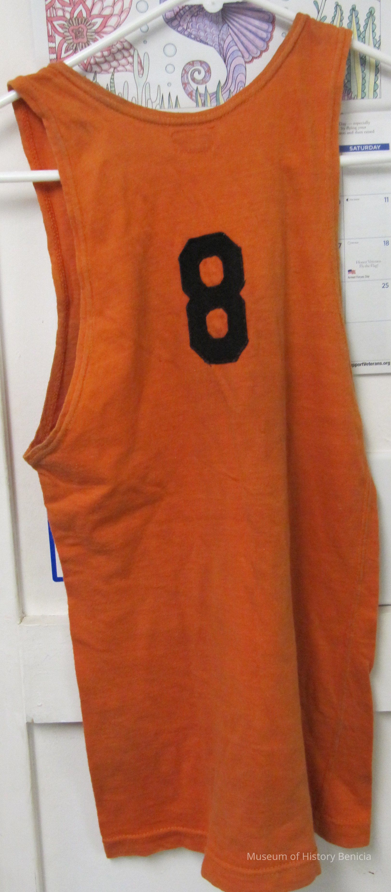 A sleeveless orange t-shirt with an "A: on the front and the number "8" on the back. Looks like a childs size. It was made by the Ellery Arms Company in San Francisco.Collection