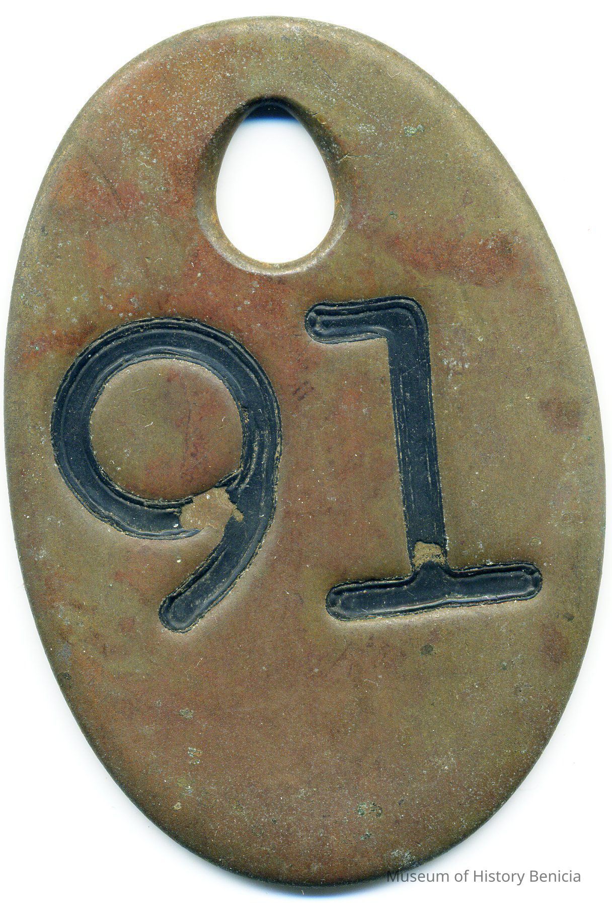 1 metal brown tag with # 91 indented in black on the front.