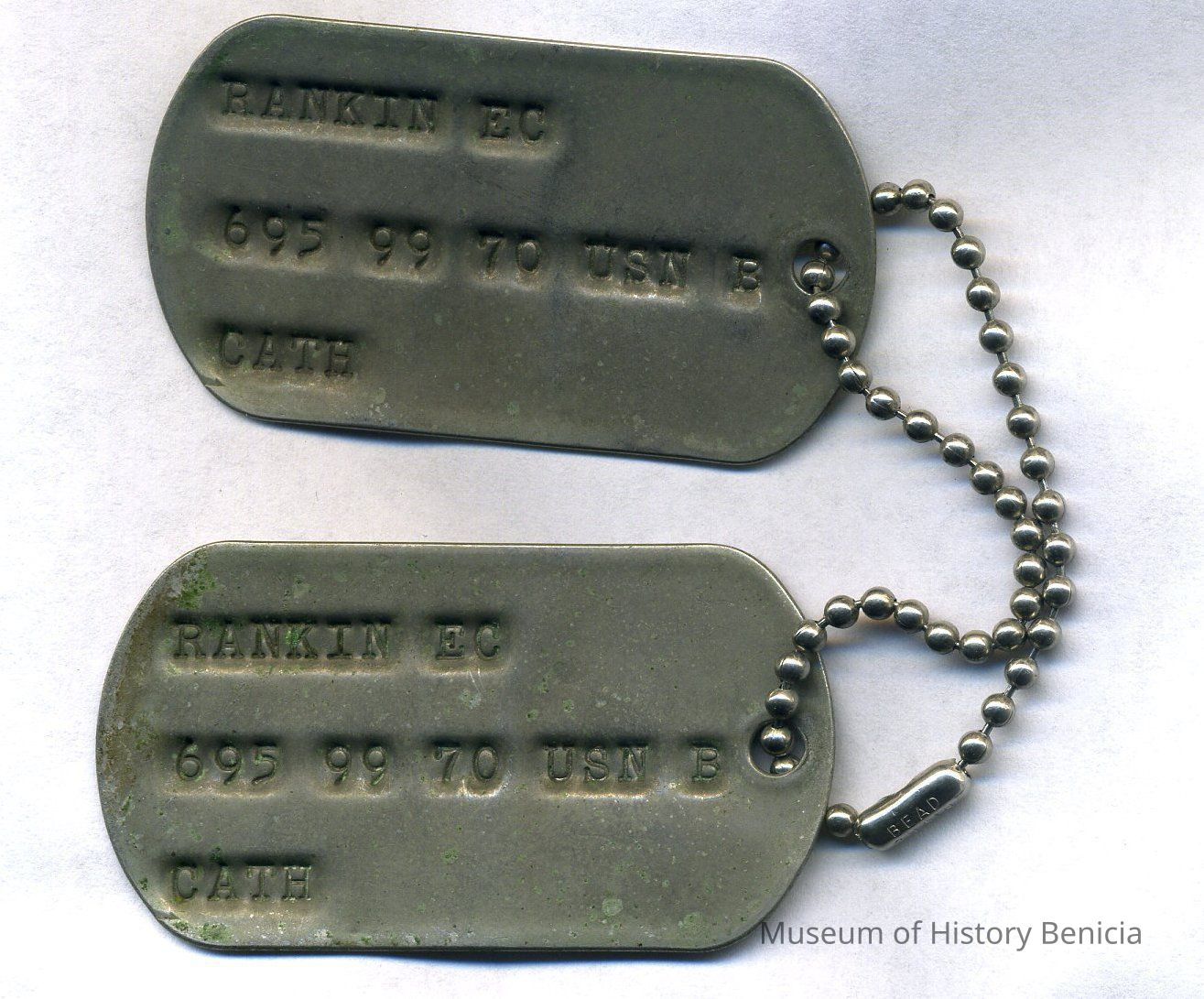 Set of two dog tags on 5-1/2" chain for Rankin EC 6959970 USN B [blood type] Cath 1-1/8" x 2" [From the Rankin Collection]
