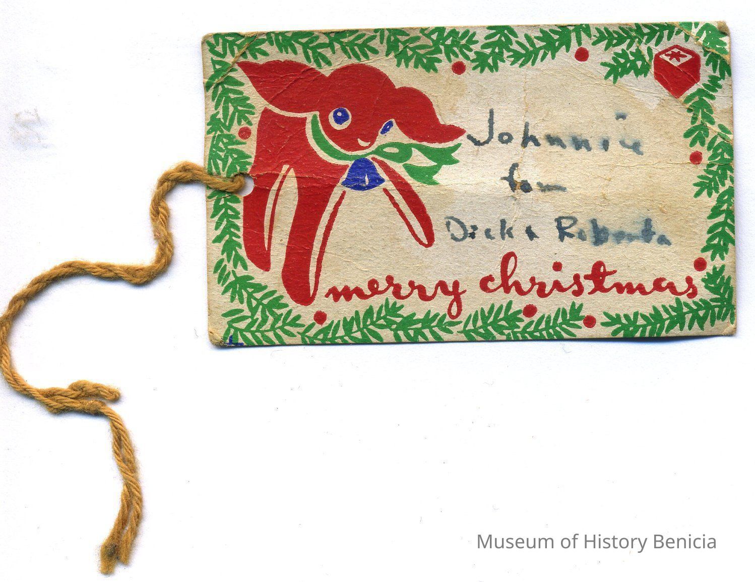 Gift Tag - Christmas Theme Red/Green; In black ink: "Johnnie from Dick + Roberta"