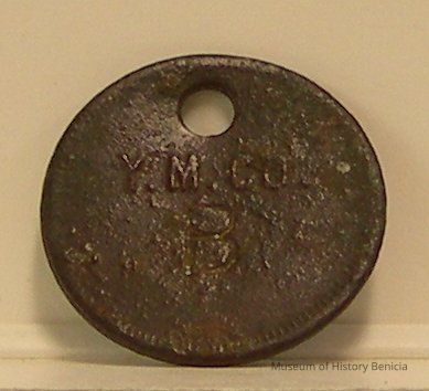 Round, metal, Identification Tag - "Y.M.Co." "8"; Yuba Manufacturing Company tag, 1-1/4" diameter