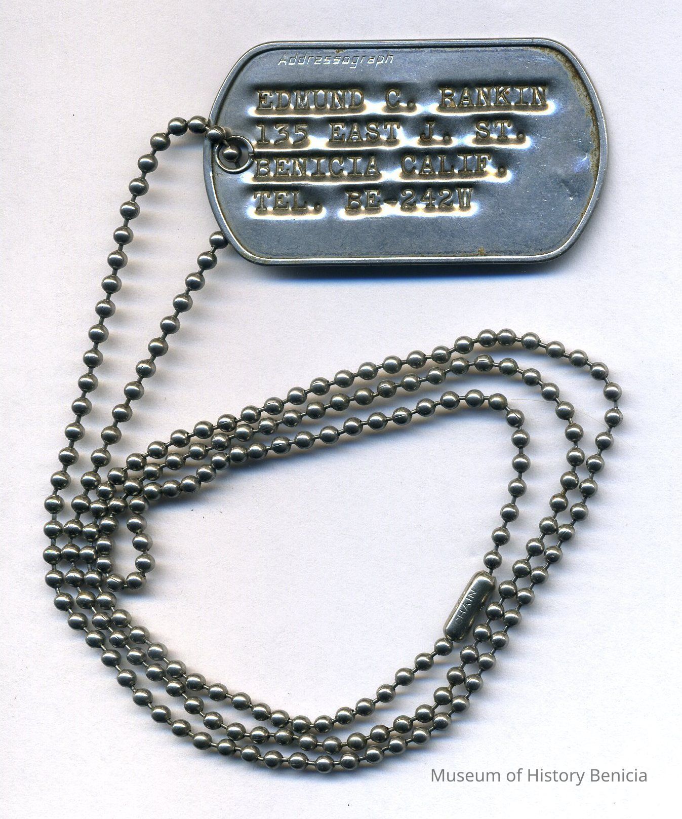 ID Tag that looks like a military "dog tag" for Edmund C. Rankin, 135 East J. St. Benicia Calif. Tel. Be - 242W; pressed by addressograph; on a 24" chain