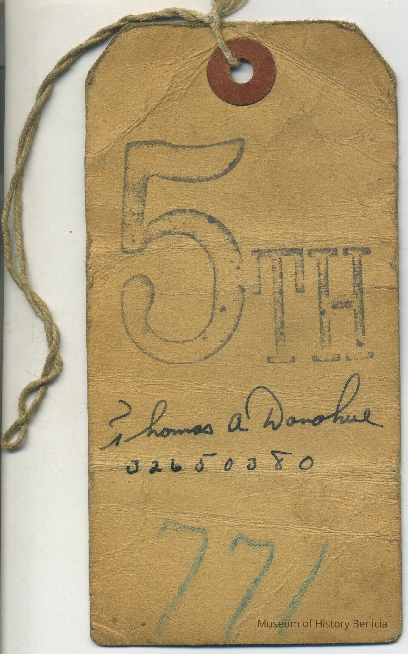 Luggage Tag - 5-1/4" x 2-1/2" card stock reenforced hole with string: "5th" "Thomas A Donohue" "32650380"