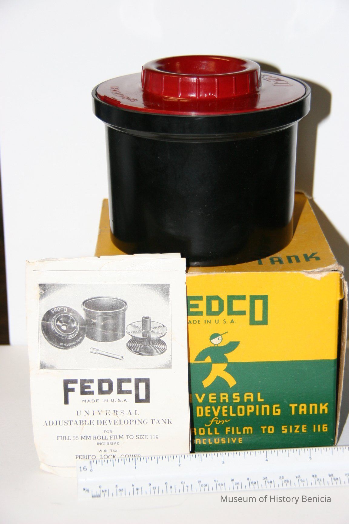 FEDCO Universal adjustable developing tank for 35mm roll film to size 116 inclusive. Has cardboard box and instructions. Tank is black with a red top.Collection