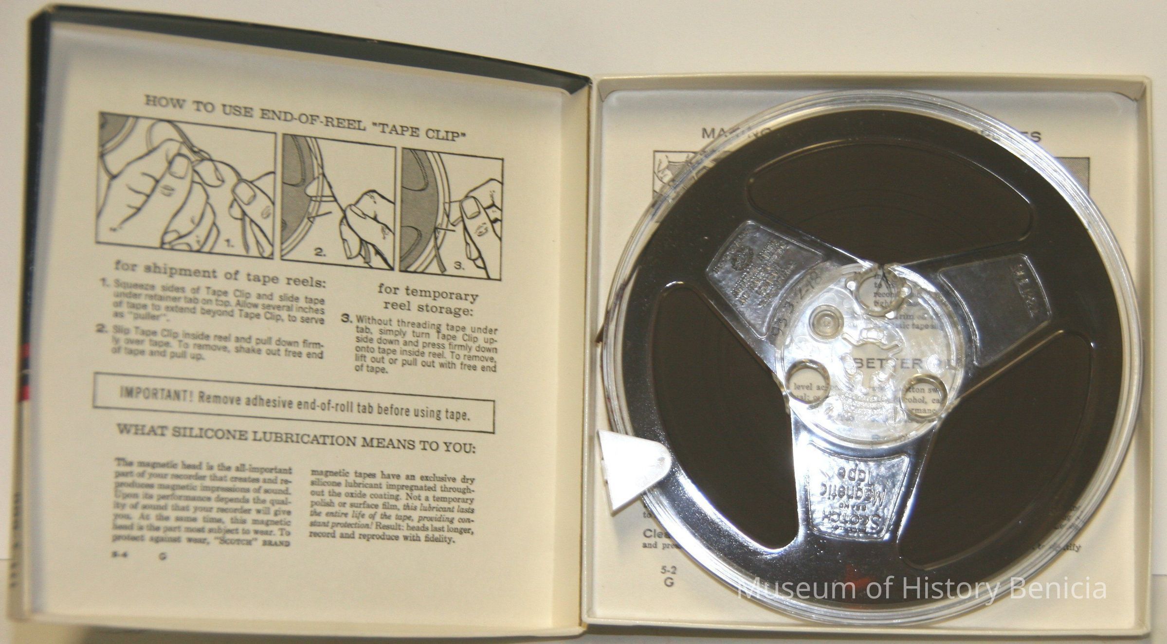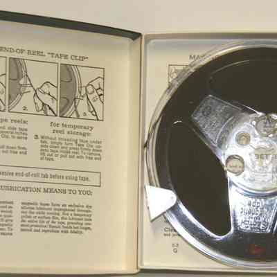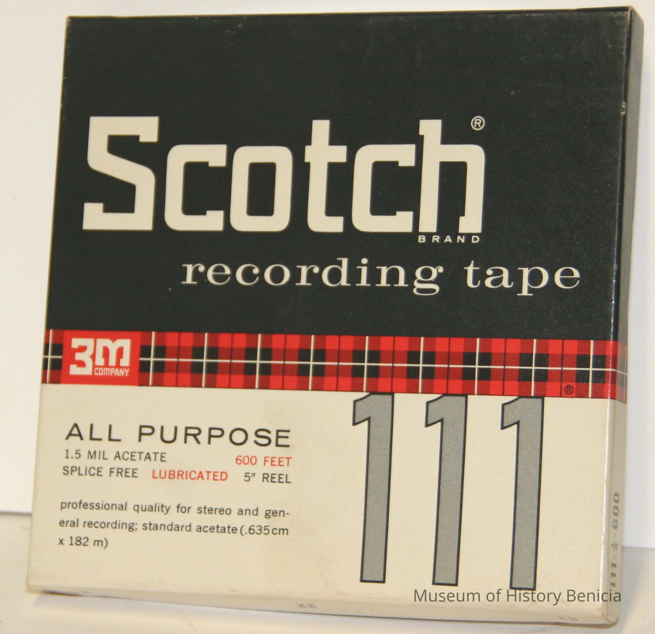 Scotch brand recordingtape all purpose 1.5mil acetate. 600 feet splice free. lubricated 5" reel. Black & white graphics on box with 111 on front. Inside box is a 5" reel with unused tape. Mfg by 3M company. Reel is made of plastic and tape is brown.Collection