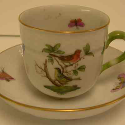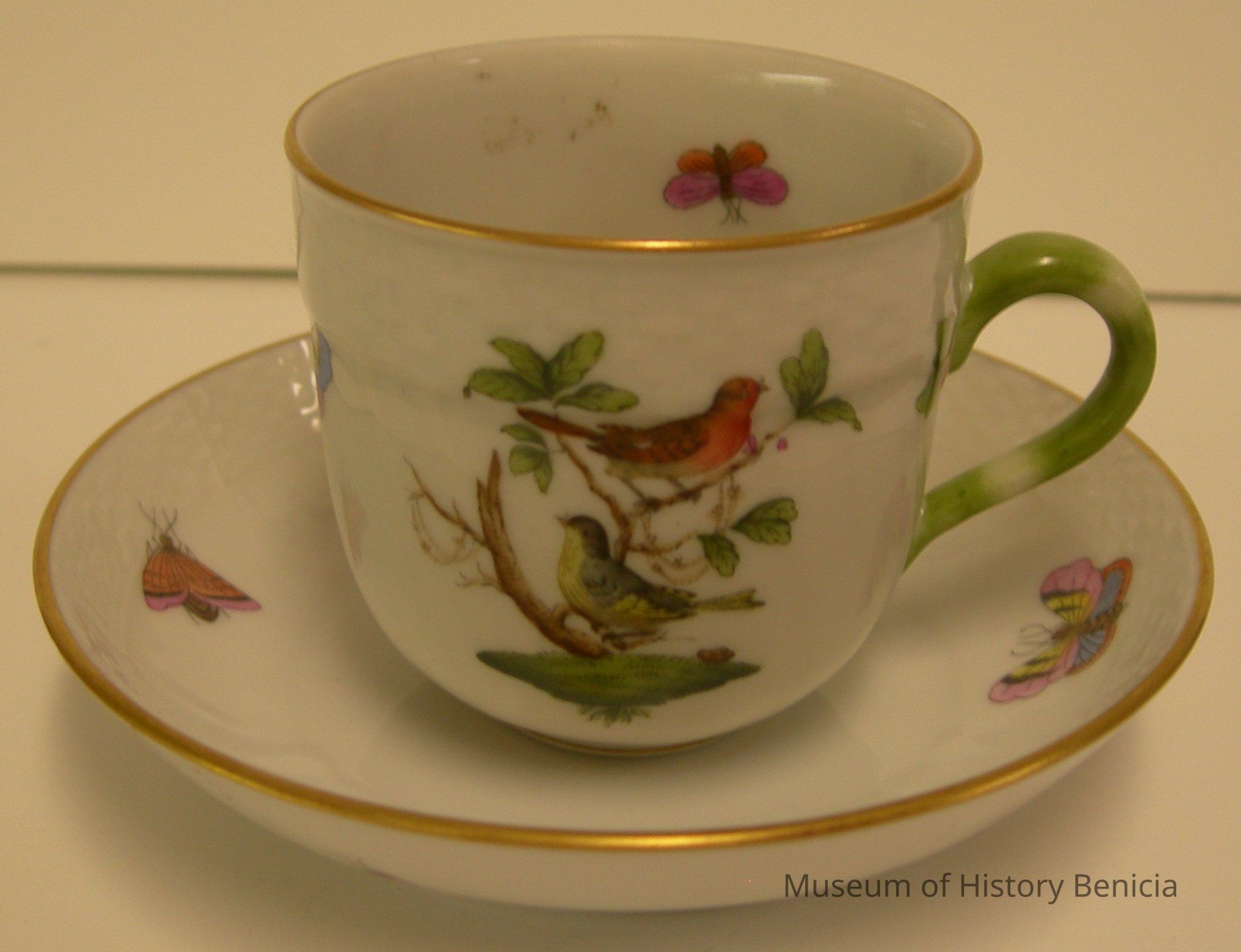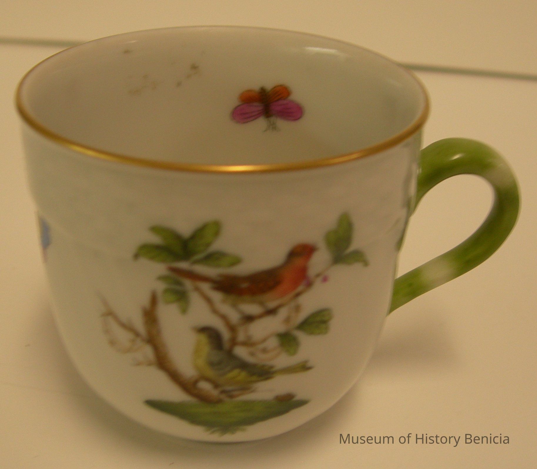 China tea cup that has markings on bottom: "Crown above a shield above Hungary and 1709" which indicated made in Hungary, Rothschild Bird porcelain cup, hand painted; two birds in branches on front, scattered on the rest of the cup are three butterflies and three groups of flowers; inside are three butterflies - one has closed wings; gold line on the rim and near the bottom, green handle;