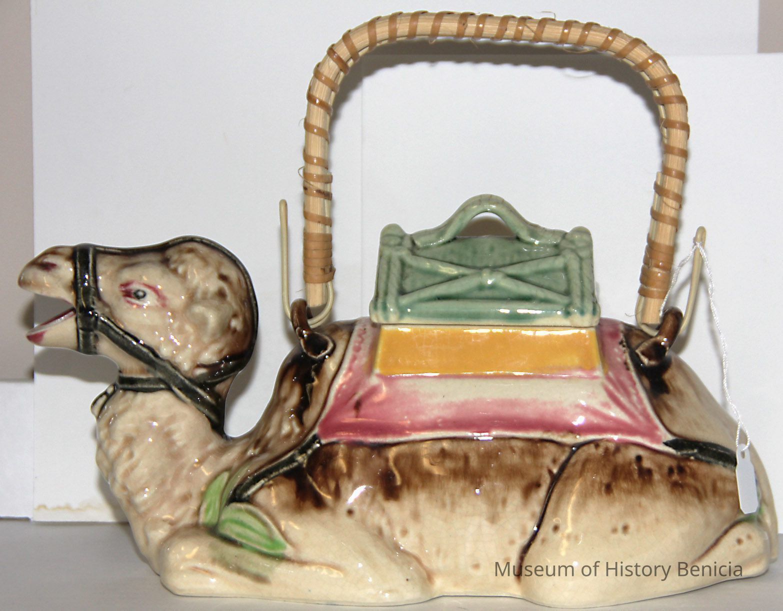 Ceramic camel teapot lid. The camel is sitting and the teapot lid is blue. The teapot is numbered 2012.028.0697.1