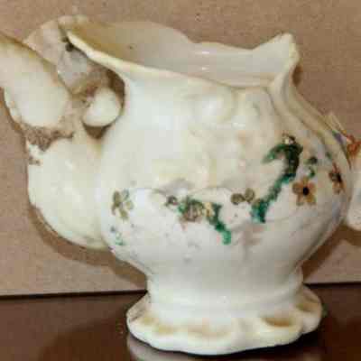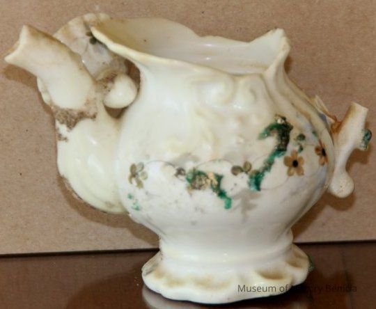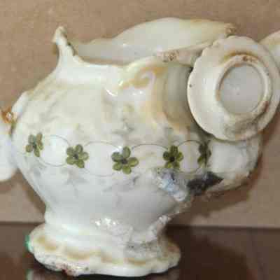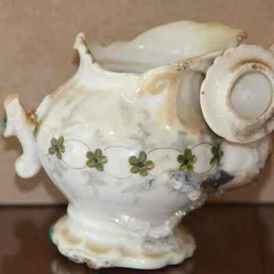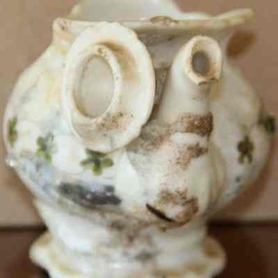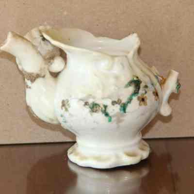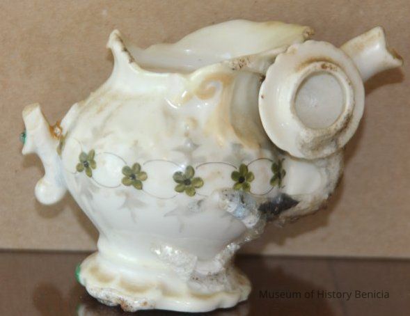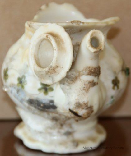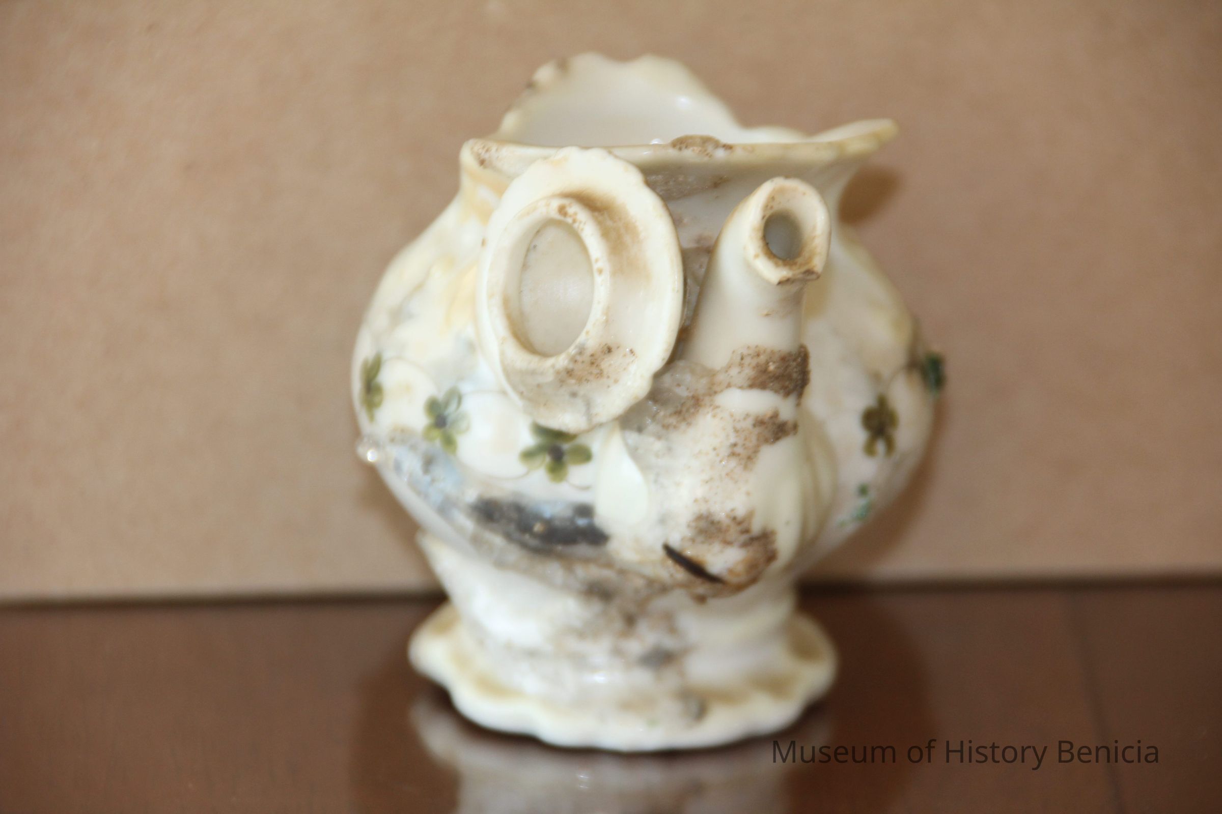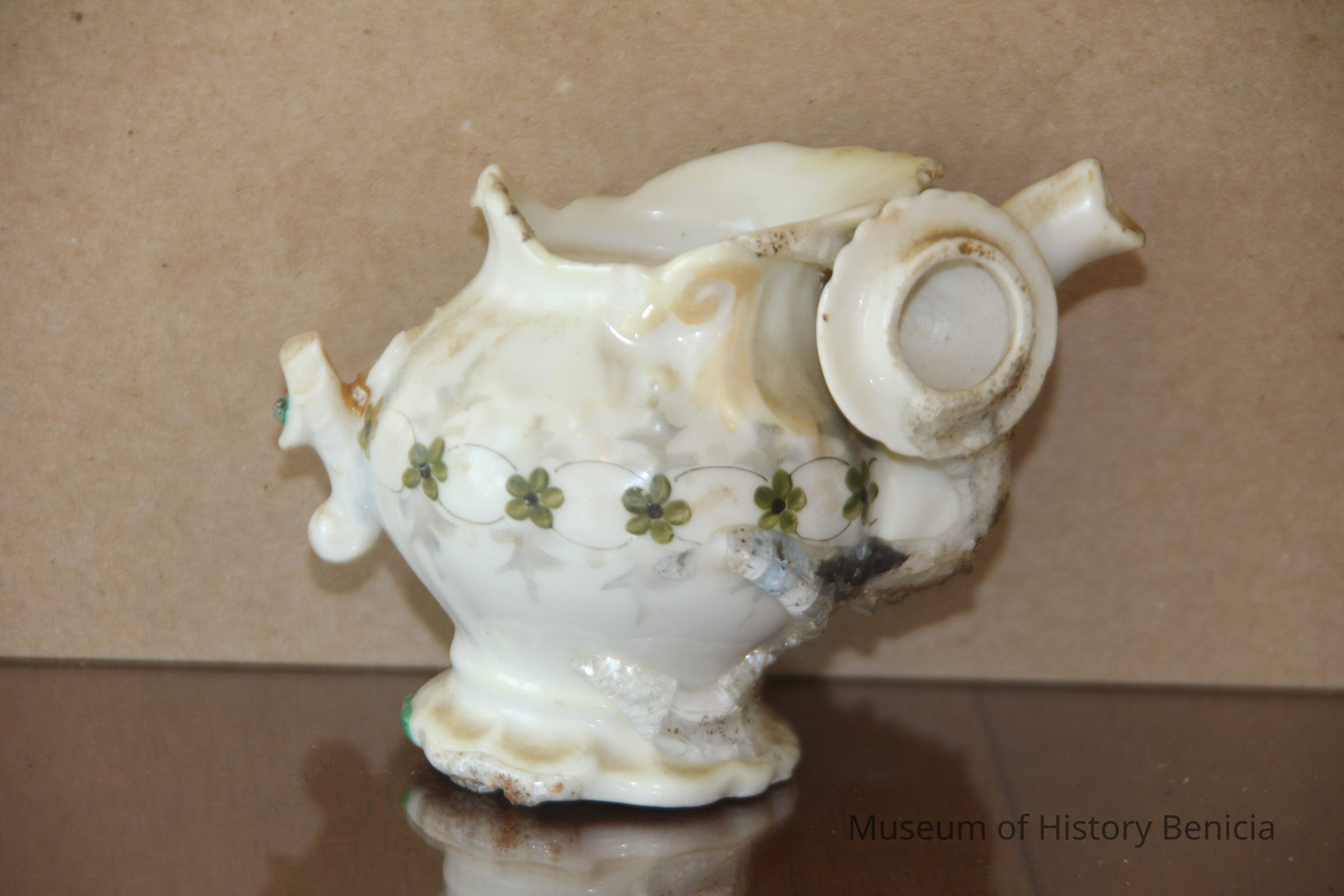 Small decorative teapot with the lid fused to the side of the teapot. This item was in the fires caused by the 1906 San Francisco earthquake. The fire melted some of the glaze and fuzed the lid of the teapot to the side of the pot.Collection