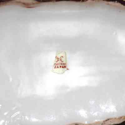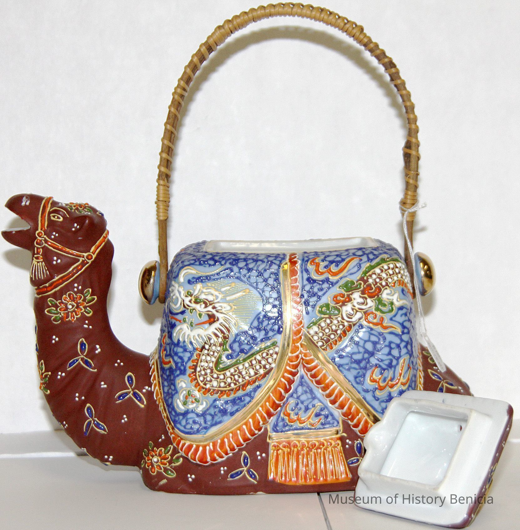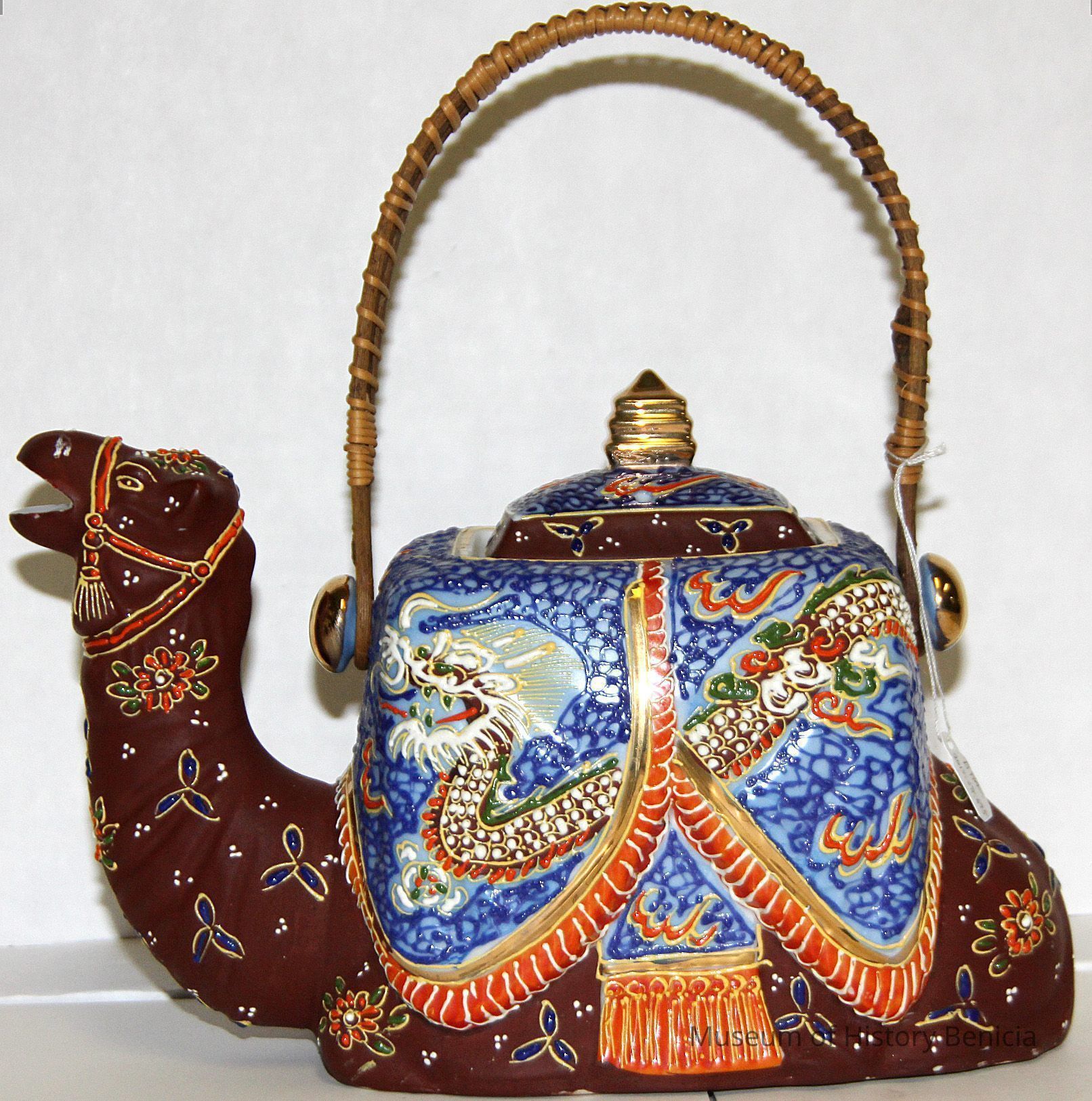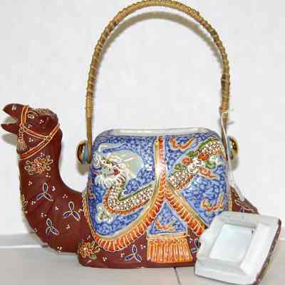 Ceramic camel teapot with a bamboo handle. The camel is painted bright blue and brown with colorful flowers. The bottom stamp says made in japan.