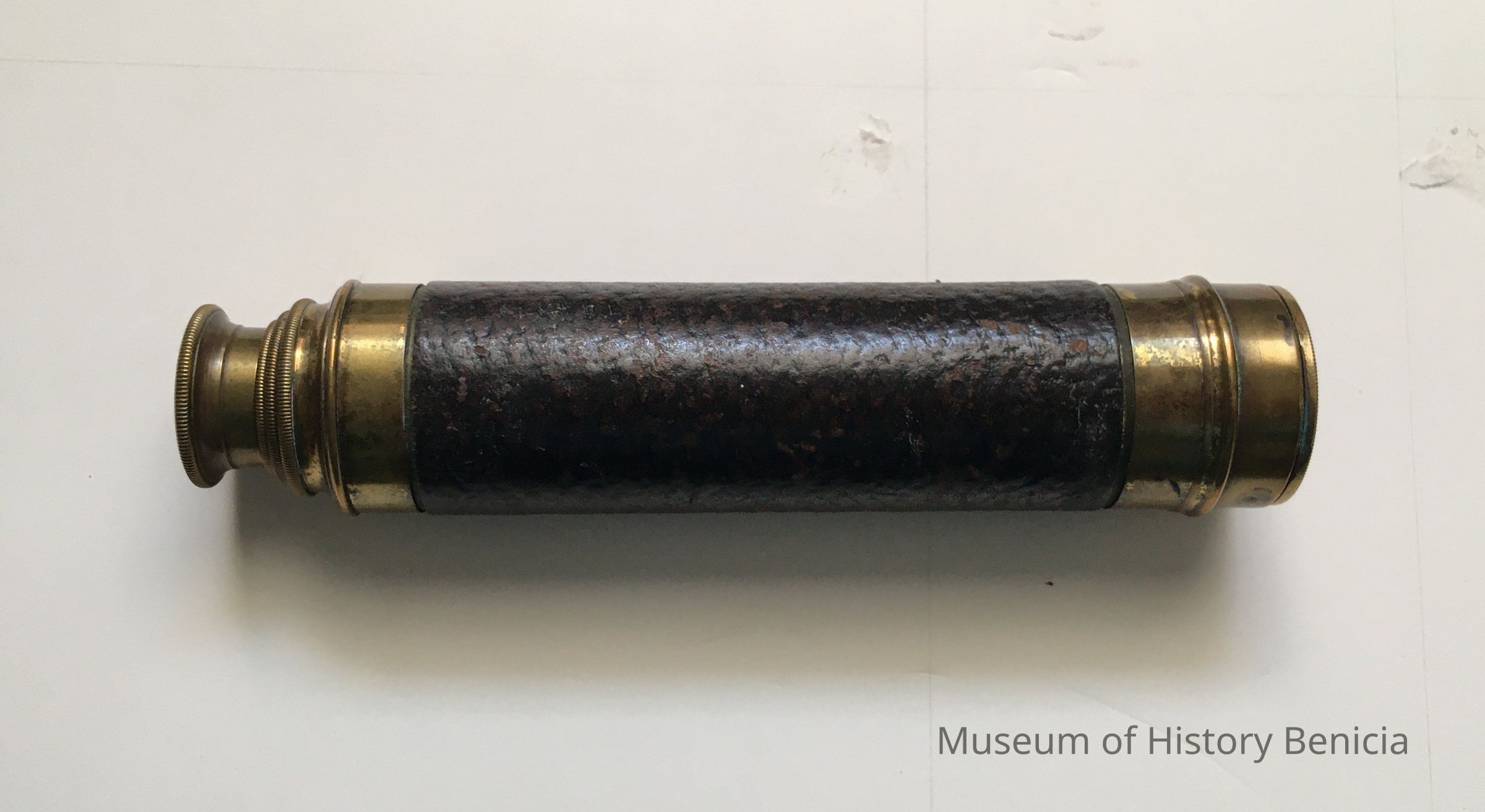 This Civil War Era French Telescope is in beautiful condition. 1.5" diameter by 7" when collapsed, and extended, 17.5”. Made of brass and covered in a thin leather veneer which is good condition with a few minor scrapes.Collection