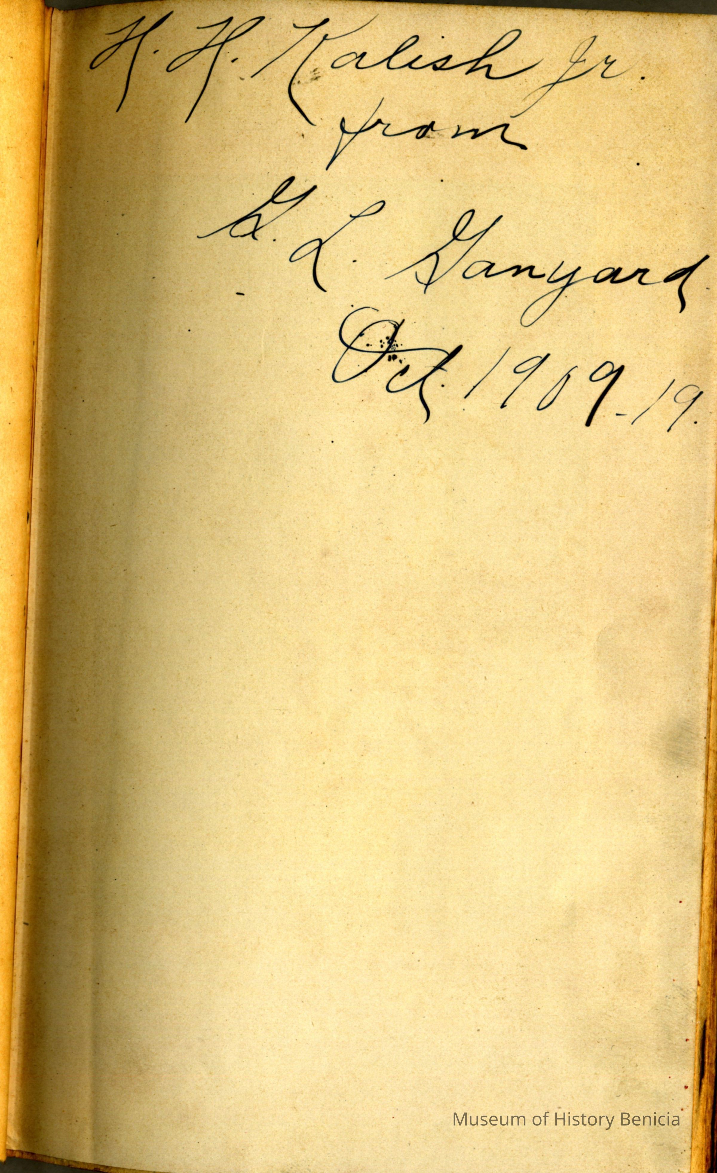 The book is inscribed to H.H. Kalish from G.L. Gaynard on Oct. 19, 1909. Mr. Kalish is Leslie Lorentzen Kvasnicka's step grandfather.
