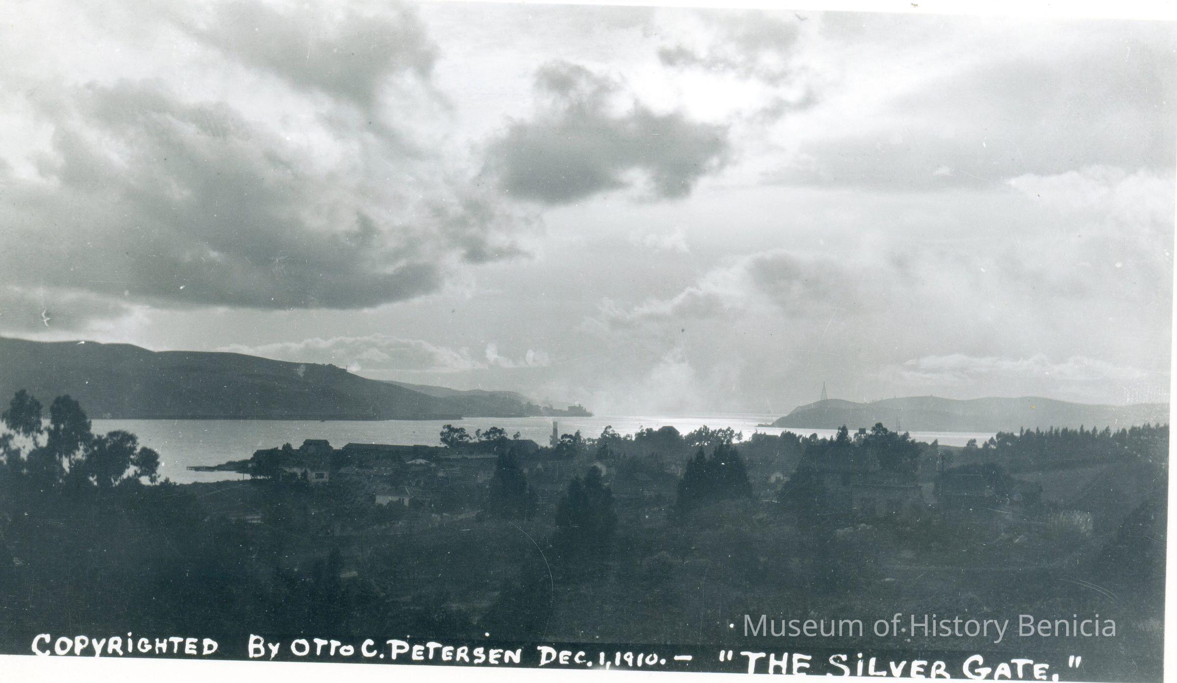 B/W photograph looking west from a Benicia hill towards the Carquinez Strait before the first bridge was built. At the lower edge of the photo in white ink is written: "Copyrighted by Otto C. Petersen Dec. 1, 1910. - "The Silver Gate."Collection