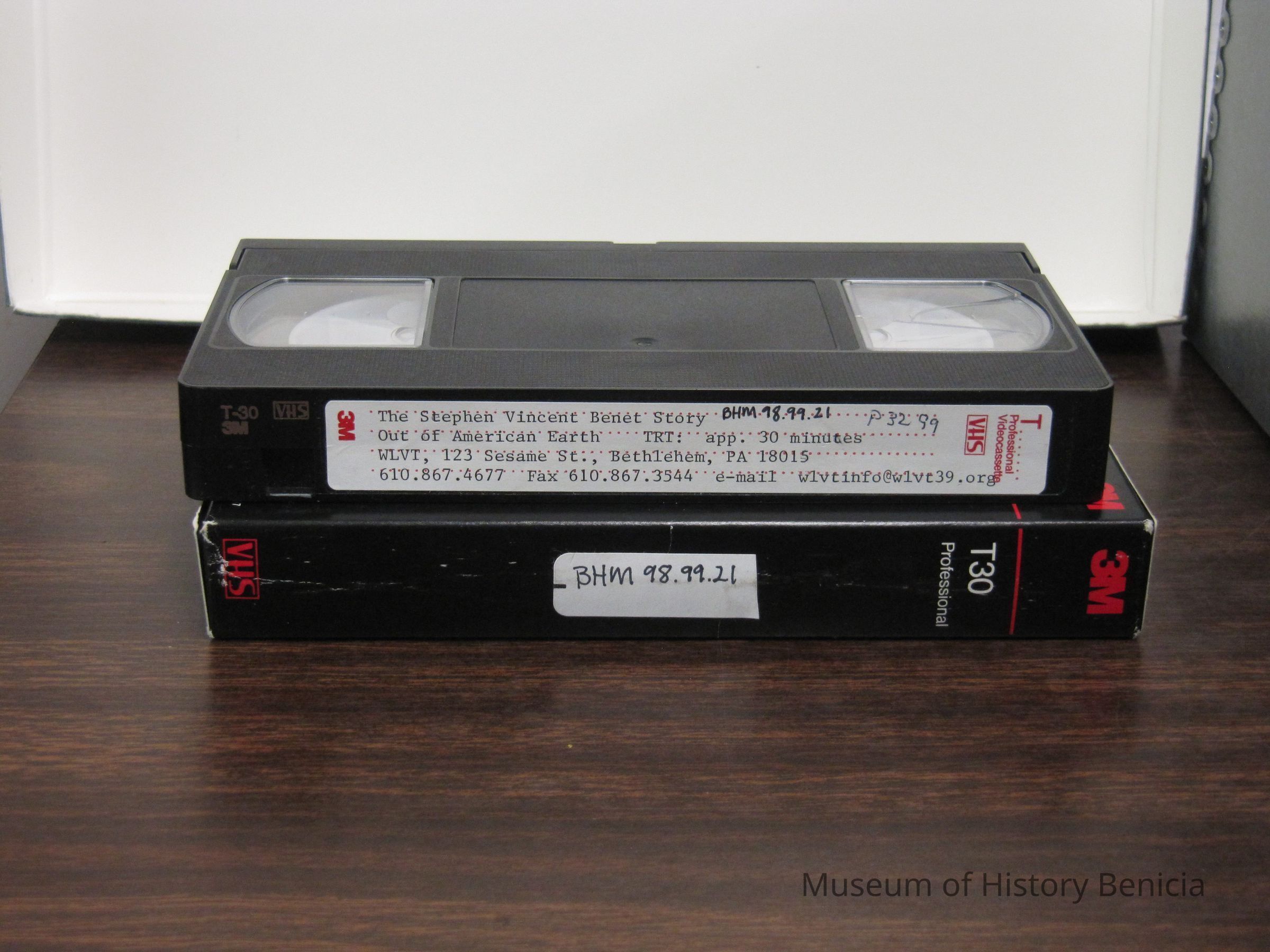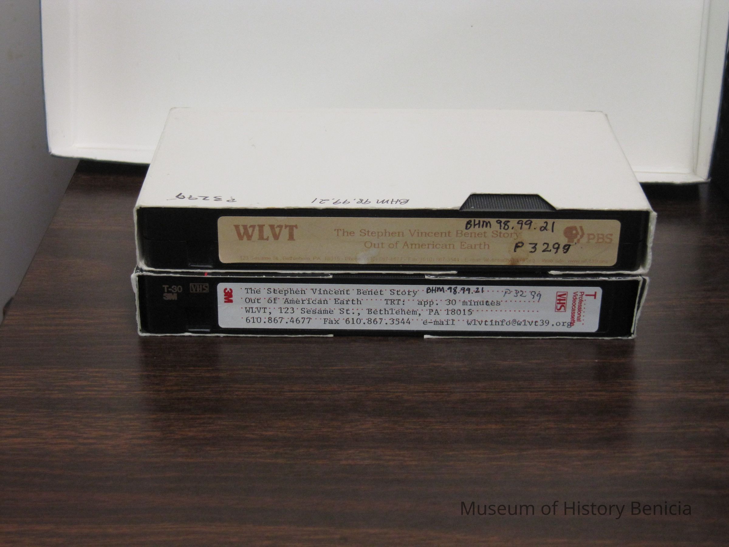 30 Minute Video Tape made by Pat McAndrew for the centennial of Stepen Vincent Benet's birth at Bethlehem, PA. Shows his life including photos of his childhood at the Benicia Arsenal 1905-11 Tom Hosley furnished photos for the production from video.