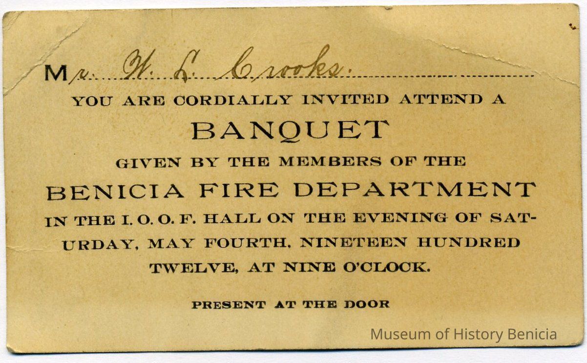 You are cordially invited attend a BANQUET given by the members of the BENICIA FIRE DEPARTMENT in the I.O.O.F Hall on the evening of Saturday, May Fourth, Nineteen Hundred Twelve, at Nine O'Clock. Present at the Door.