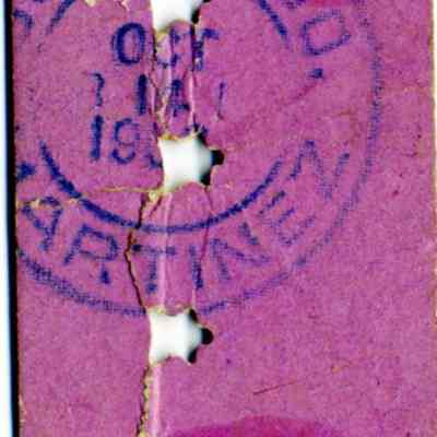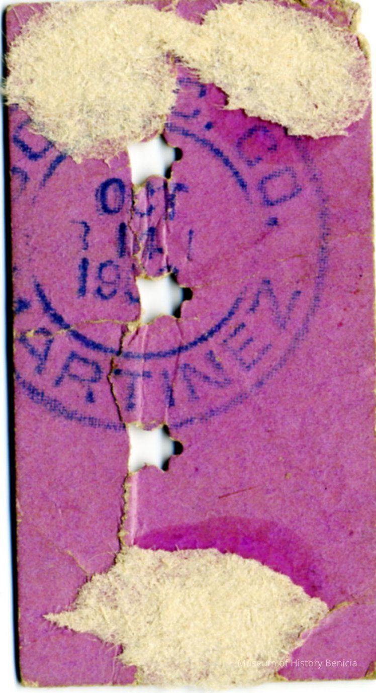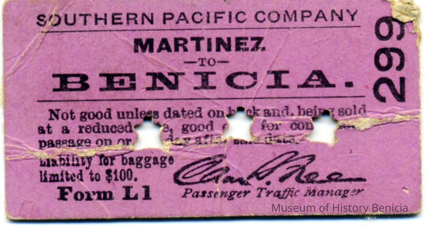 This is a ticket to ride the Martinez - Benicia ferry from the Southern Pacific Company. It is date stamped on the back as October 14, 19??. The punches have destroyed the year.