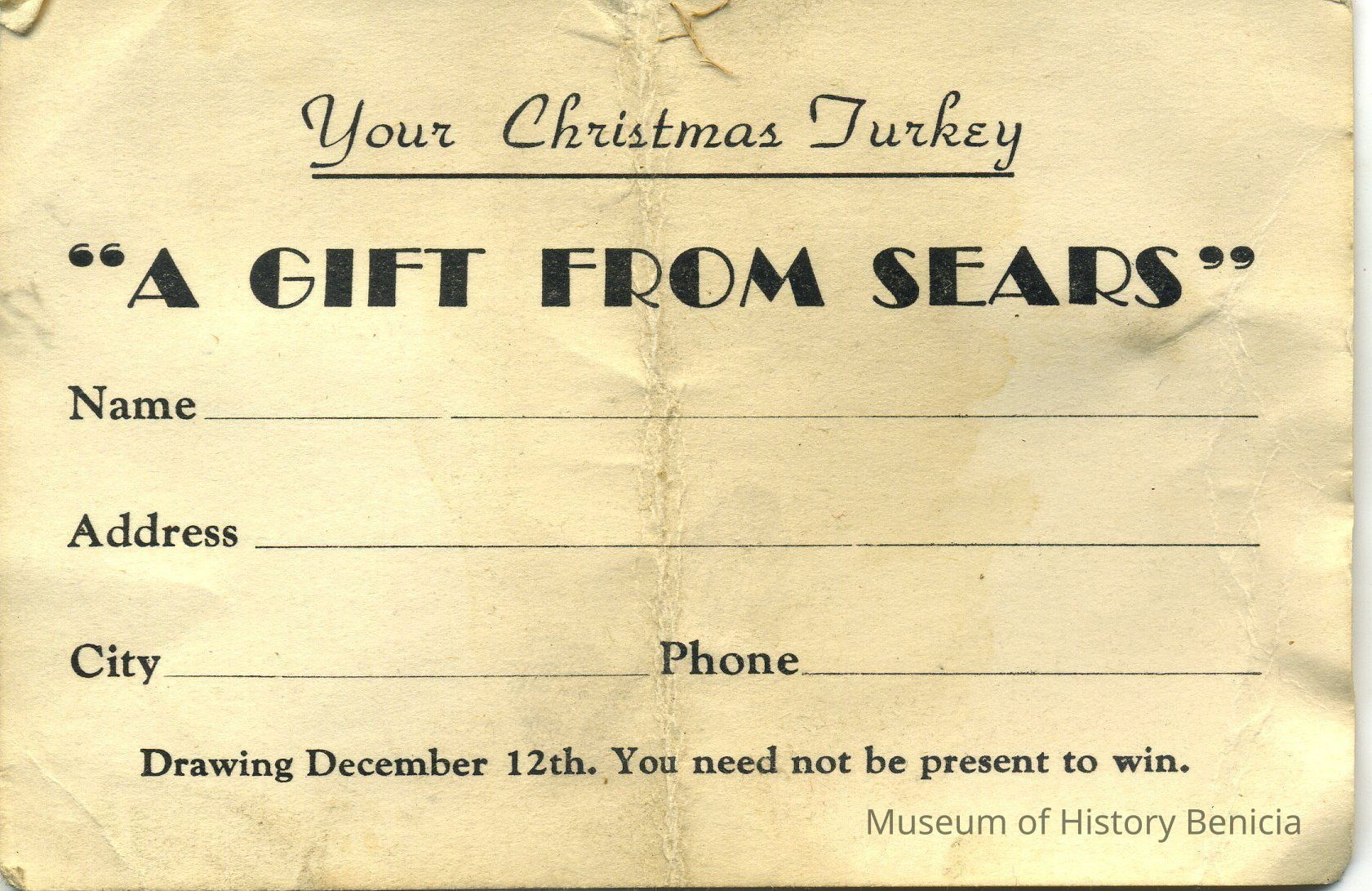 "Your Christmas Turkey / A Gift From Sears / Name _______ / Address _______ / City _______ / Phone _______ /