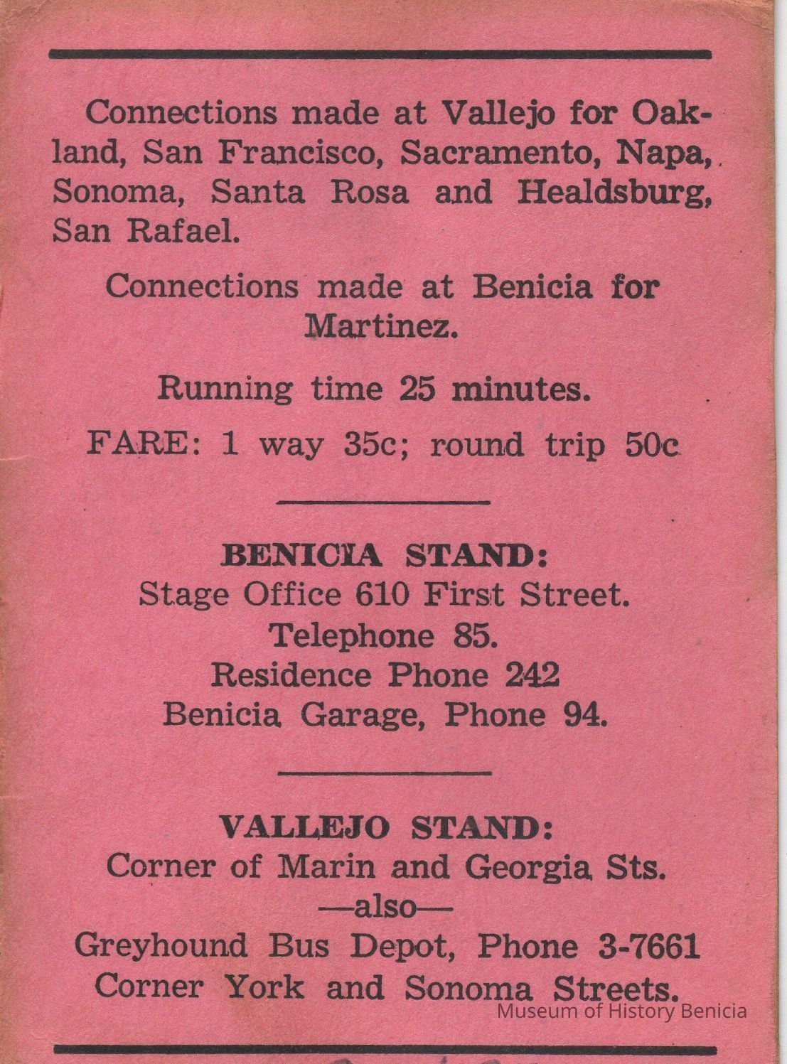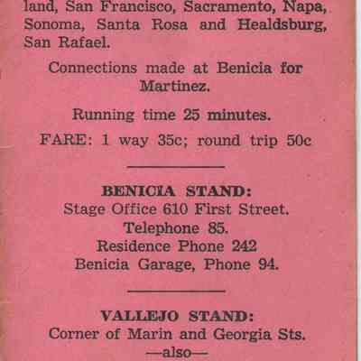 Benicia Stand: Stage Office 610 First Street / Telephone 85 / Residence Phone 242 / Benicia Garage Phone 94