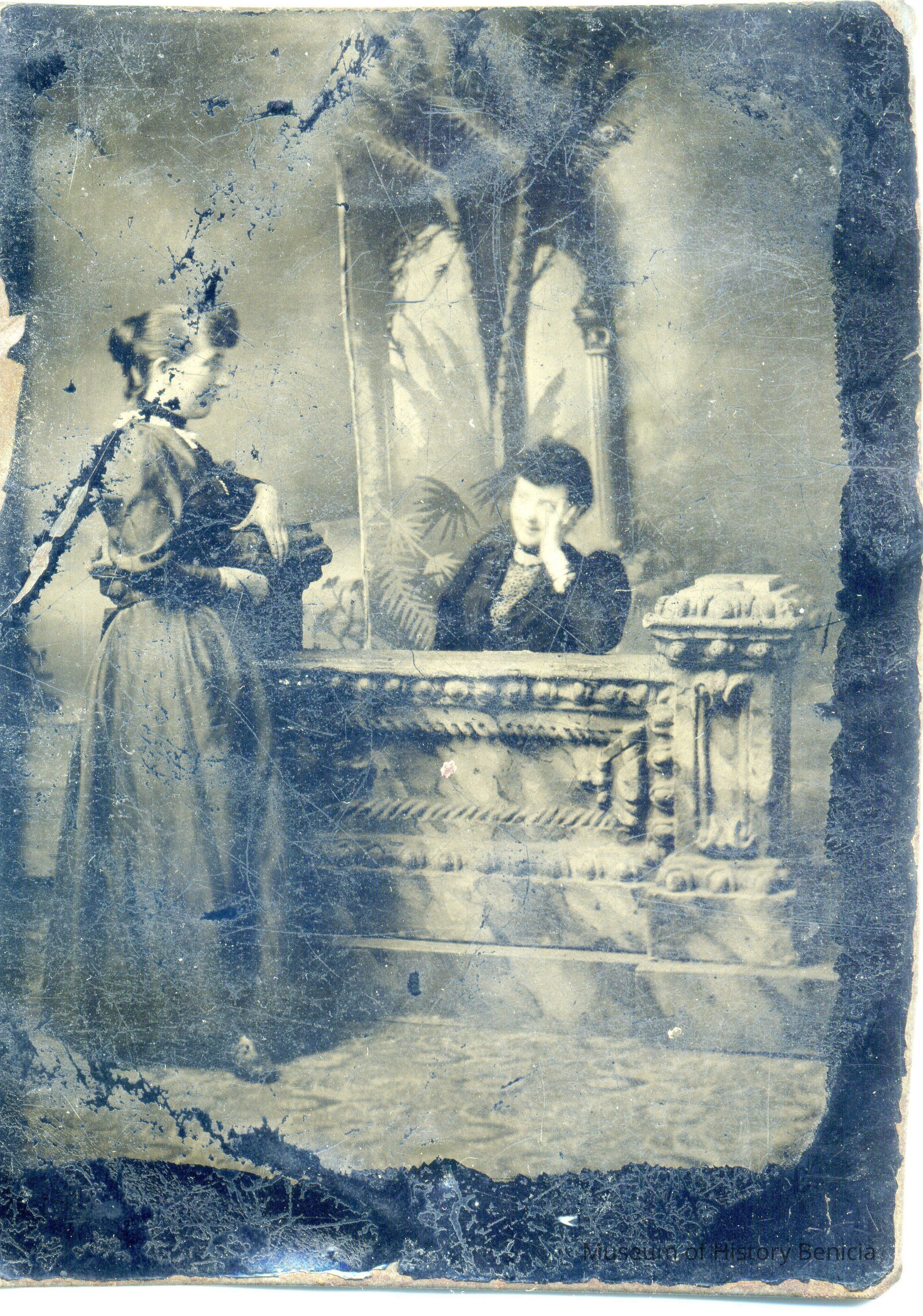 An eighth plate tintype of two women in a studio setting. One is sitting behind a desk or wall and the other is standing in front of her.