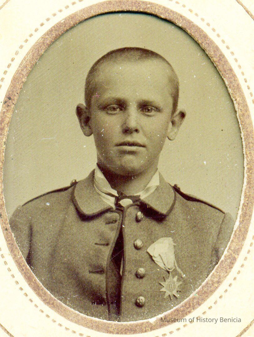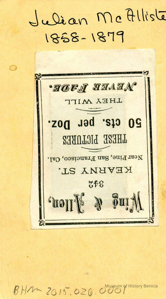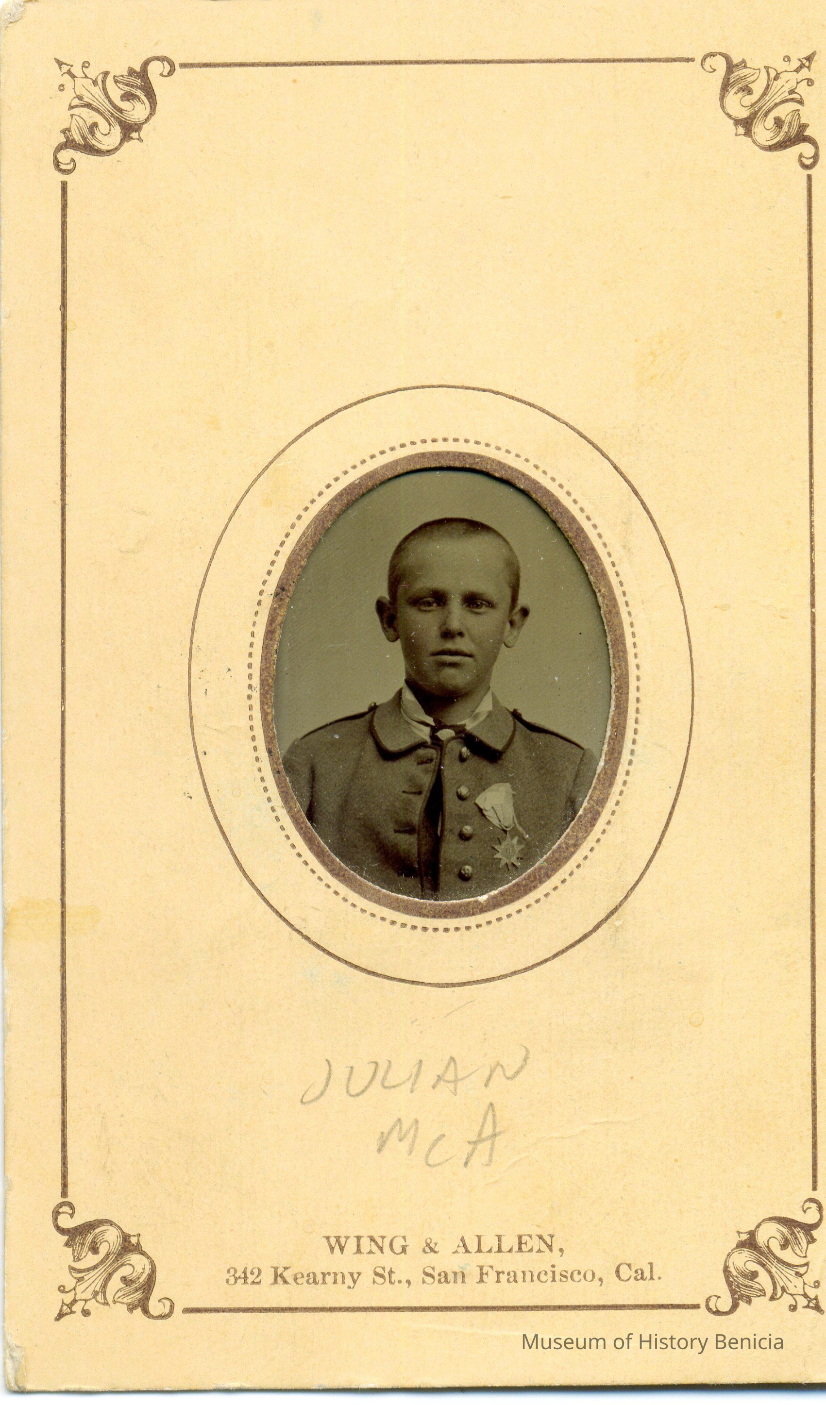 This is a tintype of Julian McAllister who was the son of Cutler McAllister who is the brother of Col. Julian McAllister, commanding officer of the Benicia Arsenal. Julian McAllister was born in 1858 and died of pneumonia in 1879 or 1880.Collection