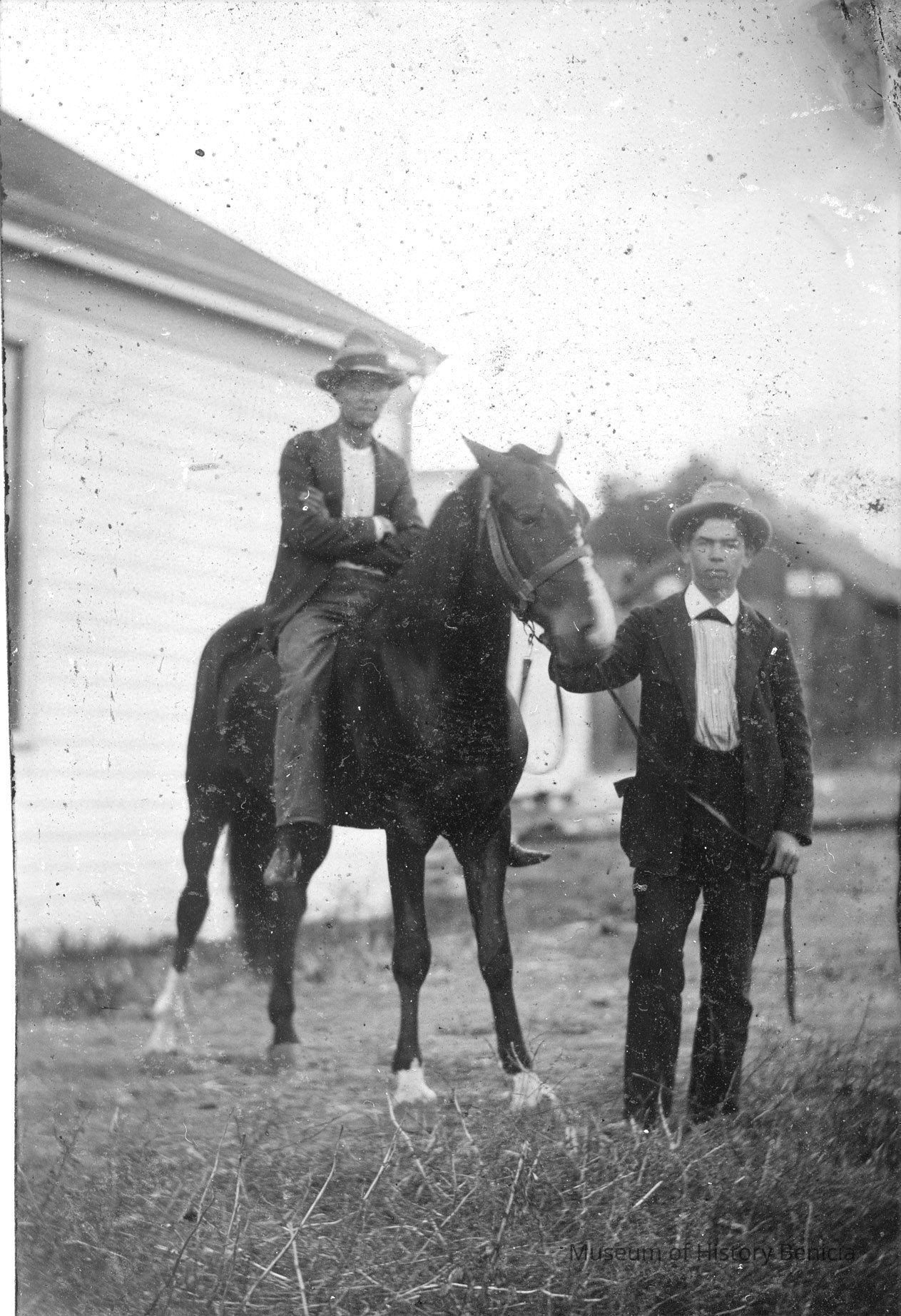 Two men with one on a horse.
