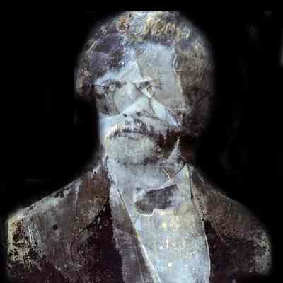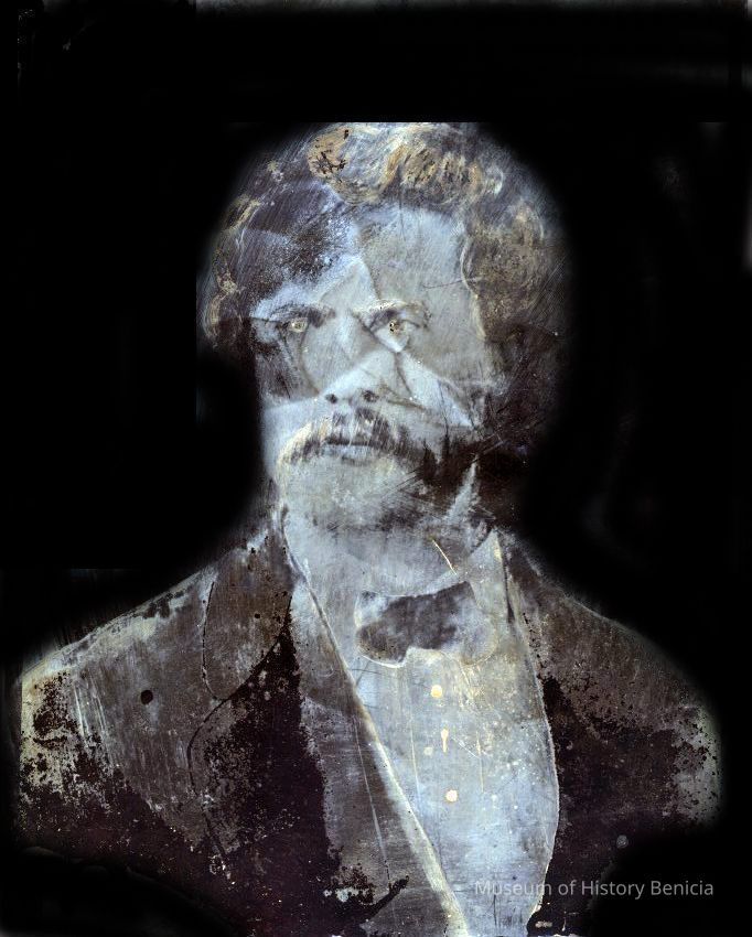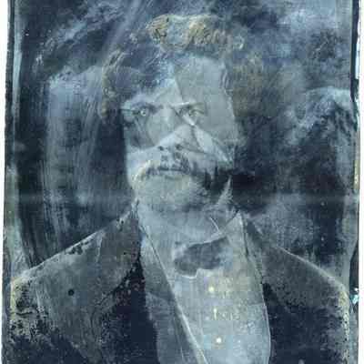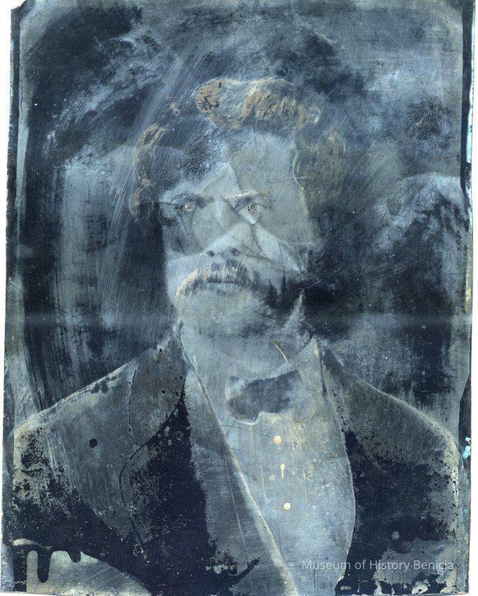 This is a photograph of a man with a mustache and bow tie. The surface is very scratched and the metal is bent a bit. There is no identification on the photo.