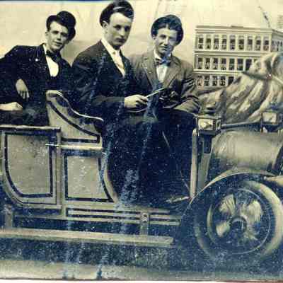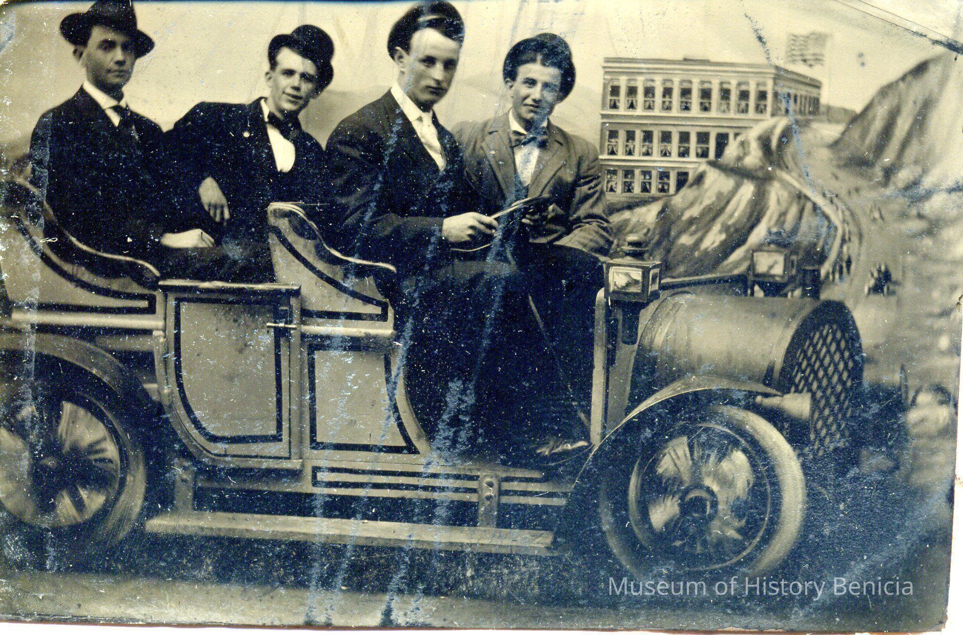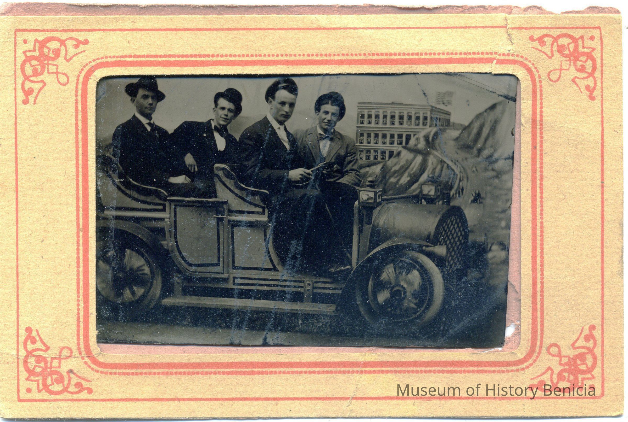 This is a tintype photo of several men taken in a studio. This tintype uses the same backdrop as two other tintypes one of which says it was taken at the Portola Festival.Collection