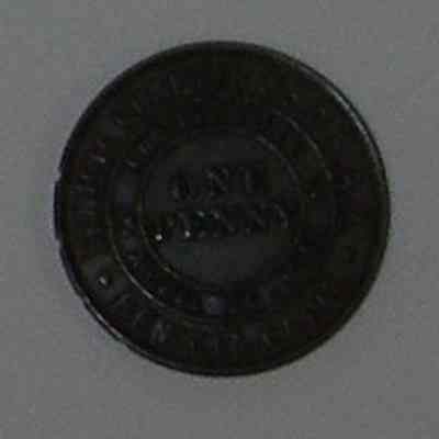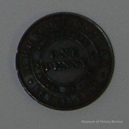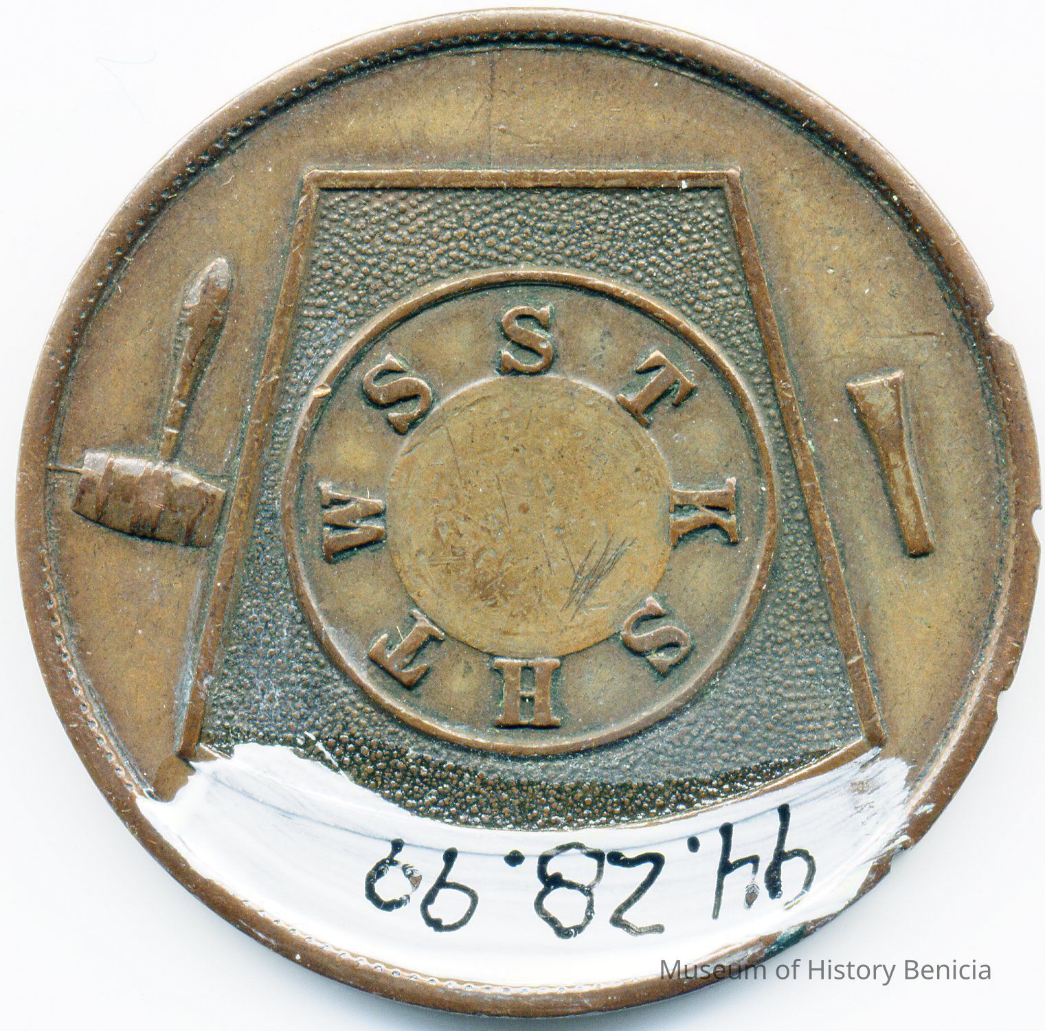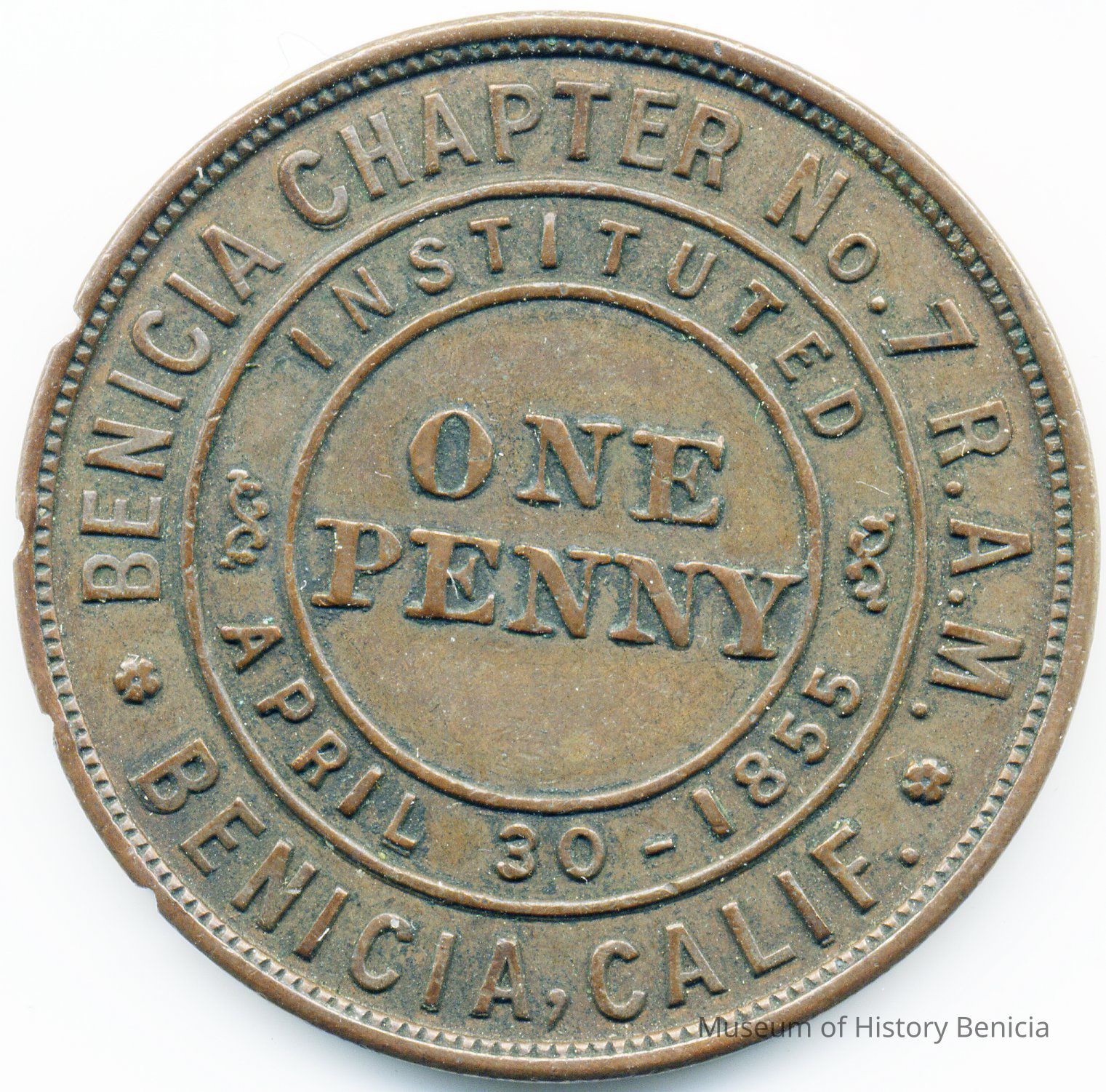 Commemorative token has intitials H, T, W, S, S, T, K, S on front; back says one penny in center and Benicia Chapter No. & R.A.M. outside, Instituted April 30, 1855 in between