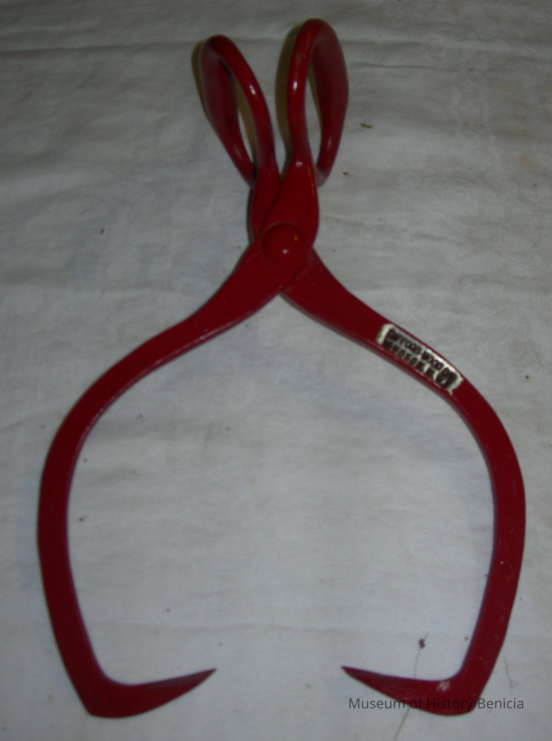 Old metal ice tongs, two handled with bent griping tips, refinished and repainted red. Made by Gifford-Wood Co. in Hudson, New York. On the underside: 542-14-1/2 in.