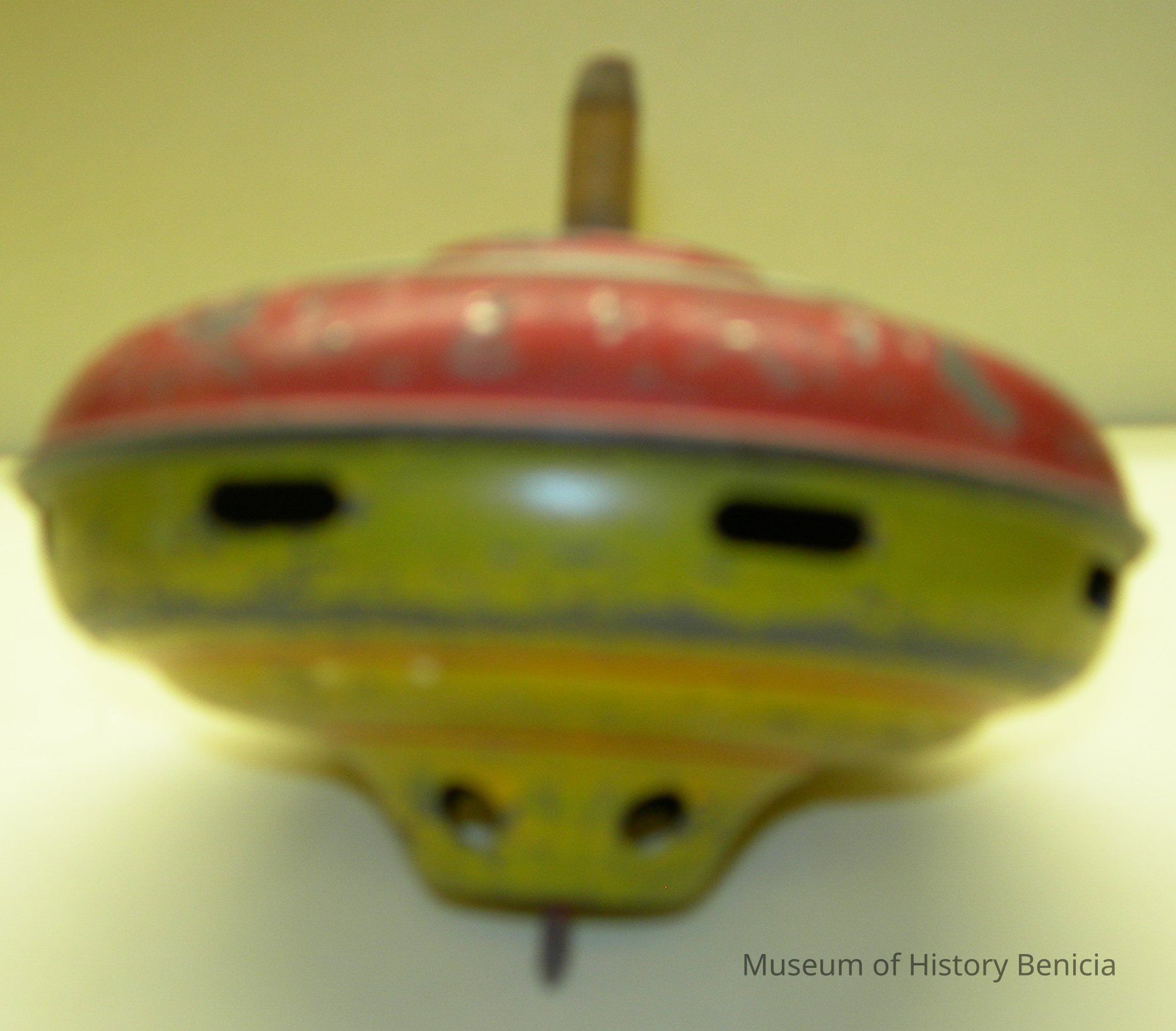 toy top, red/white on top, yellow on bottom; a style of a "flying saucer", graduated levels and holes in the lower section