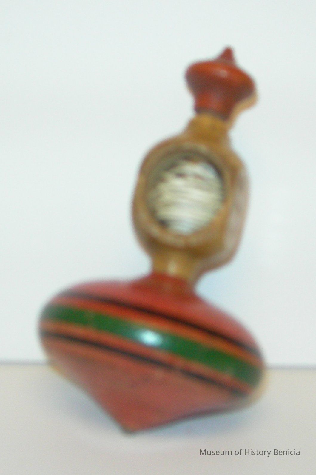 Turned top with orange pt'd acorn finial atop stem. String housing on stem is open on one side; stamped "PATENTED JULY 11, (1900? 1890?)" on 2 sides. Top is painted orange-red with a green band flanked by black. Metal tip. Modern string.Collection