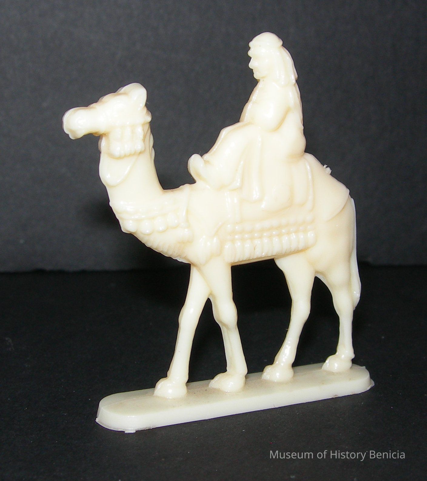 white plastic camel with a rider on a stand; similar to "Cracker Jack" or penny machine prizes, might be from a set of molded plastic animals i.e. exotic animals
