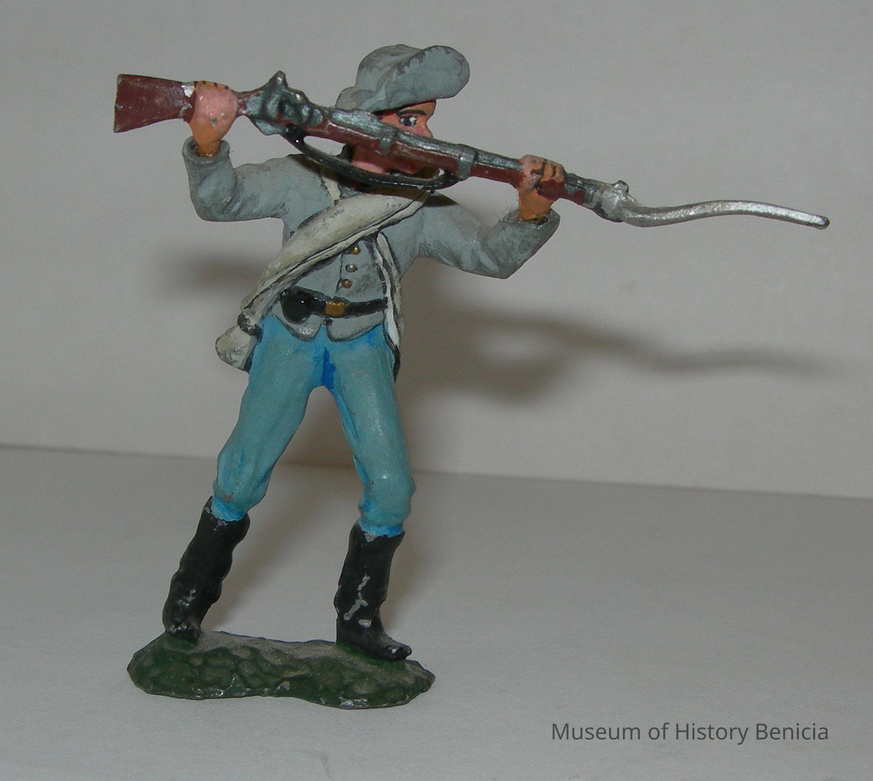 toy soldier with rifle in position to stab someone with his bayonette; gray coat and hat indicate a confederate/rebel soldier; good detail with uniform and accessories, appears to be hand-painted; standing on a flat base; metalCollection