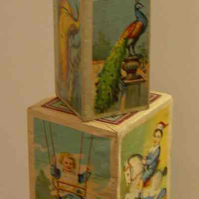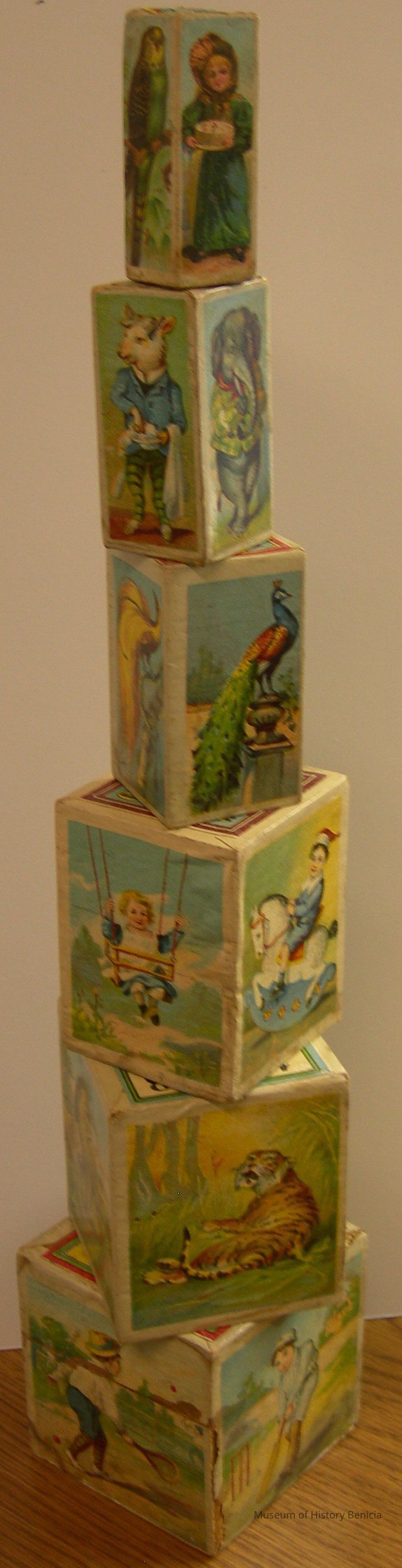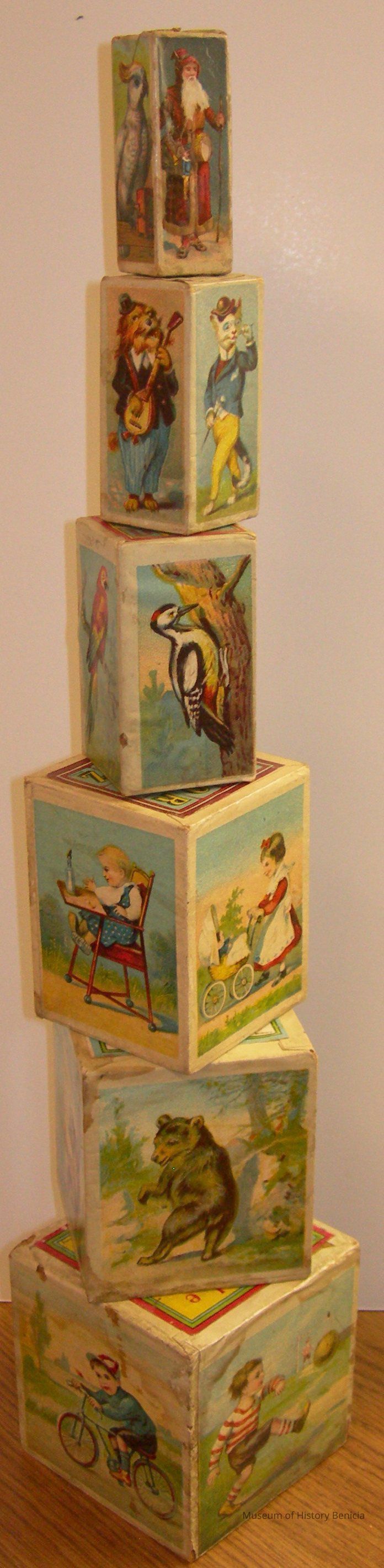 Toy - blocks made of cardboard with color illustrations, they stack with small ones nesting in the next larger; there are six but one is missing from the set