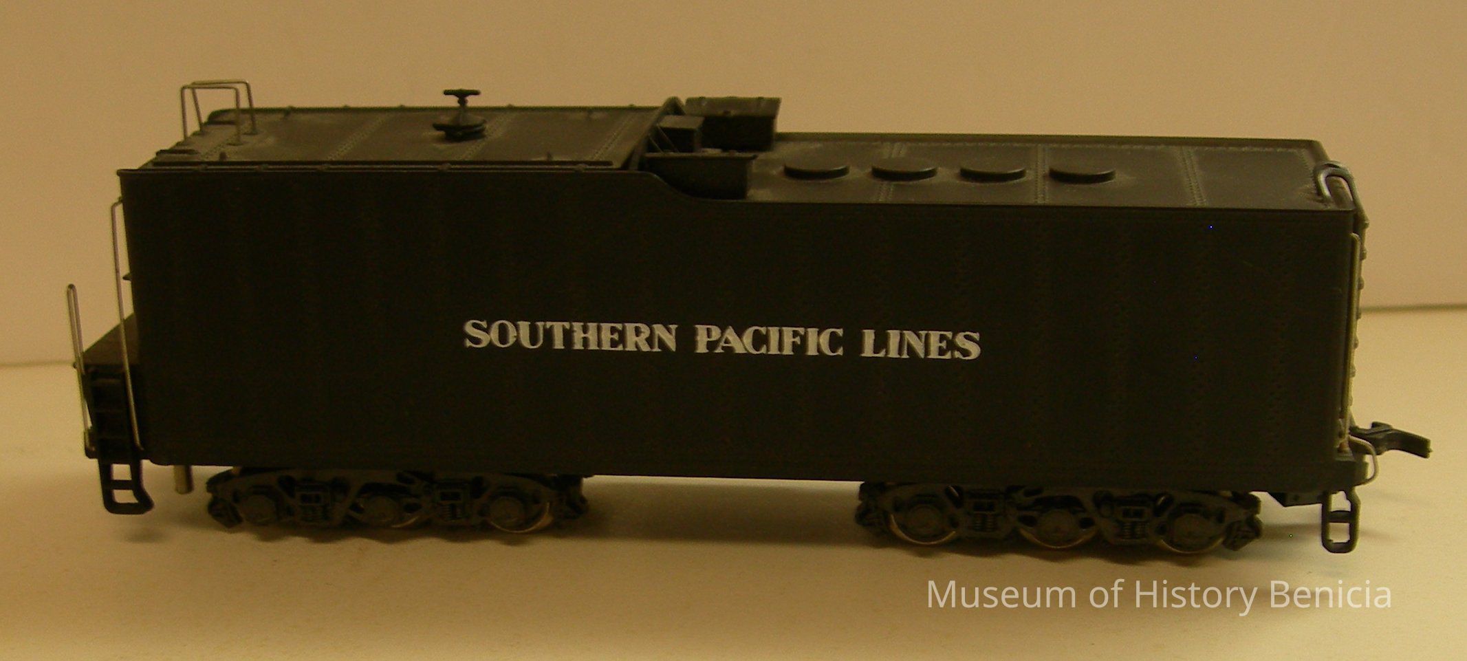 Toy plastic train car - Engine Assist Car; Black with white lettering: "Southern Pacific Lines"; 6-1/2" long x 1-1/2" wide x 2" tall; triple axles and runs on 3/4" track