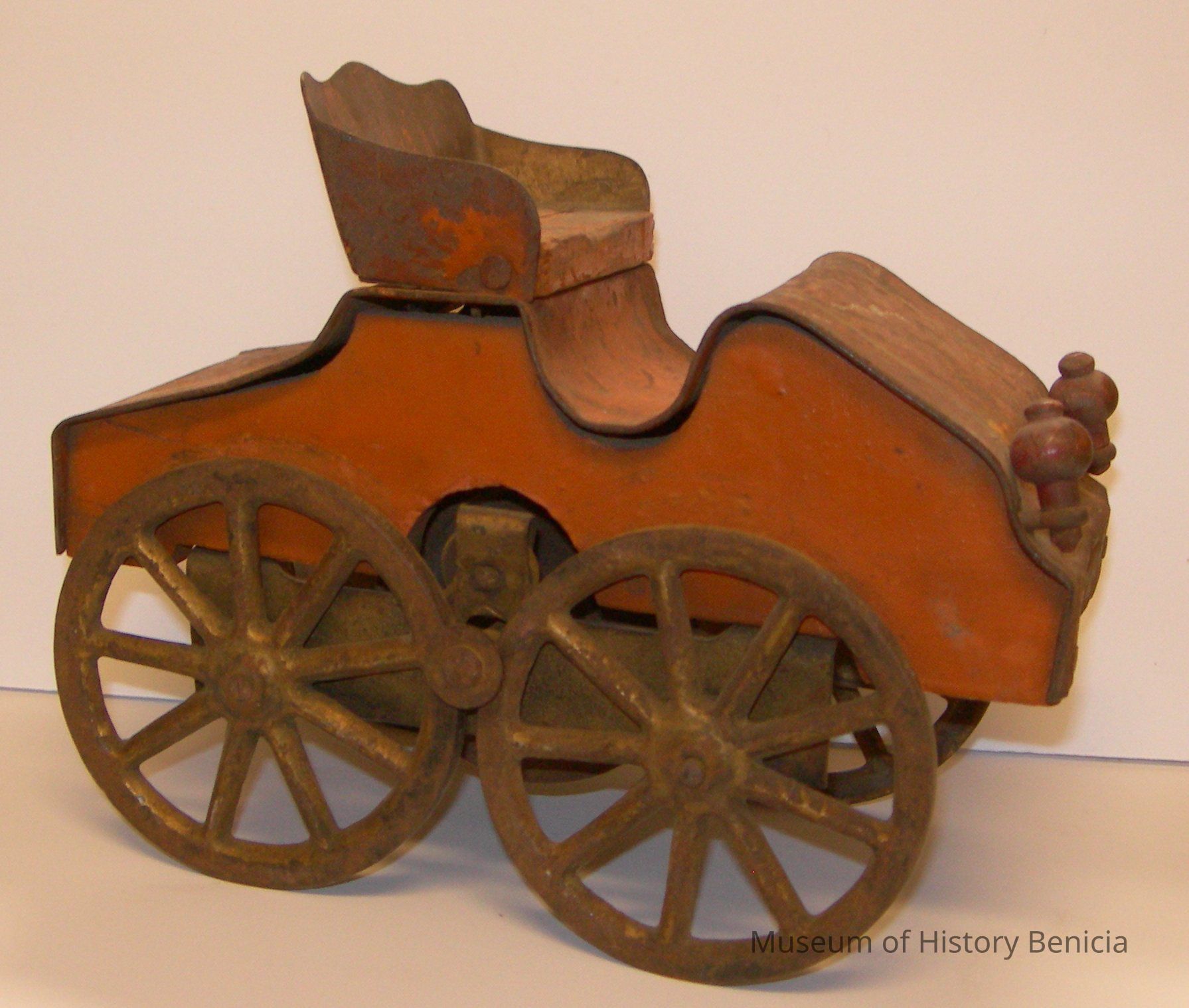 Orange painted body with metal cover painted orange with gold stripes; two red painted wood lights; metal wheels painted gold turn by flywheel underneath center - apparently ran on a track.