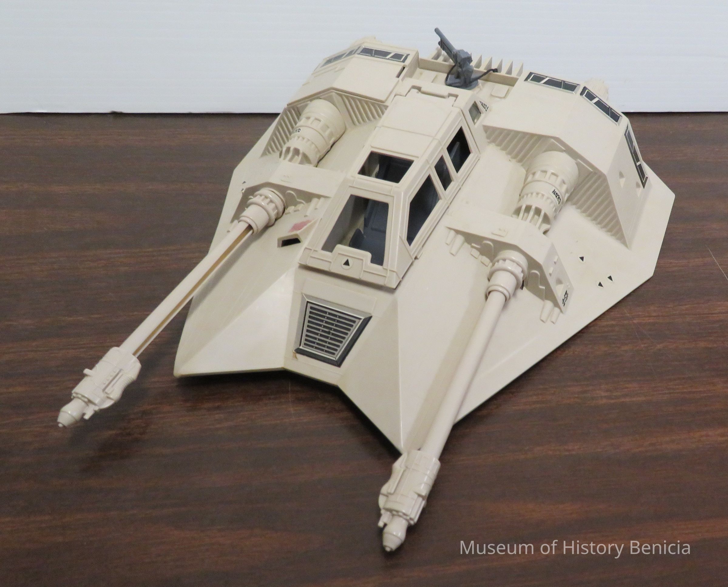 Star Wars rebel snowspeeder from the Battle of Hoth (The Empire Strikes Back, 1980). Has a larger Luke Skywalker that fits inside of the the sitting area. It has two guns that stick out in the front and one in the back.Collection