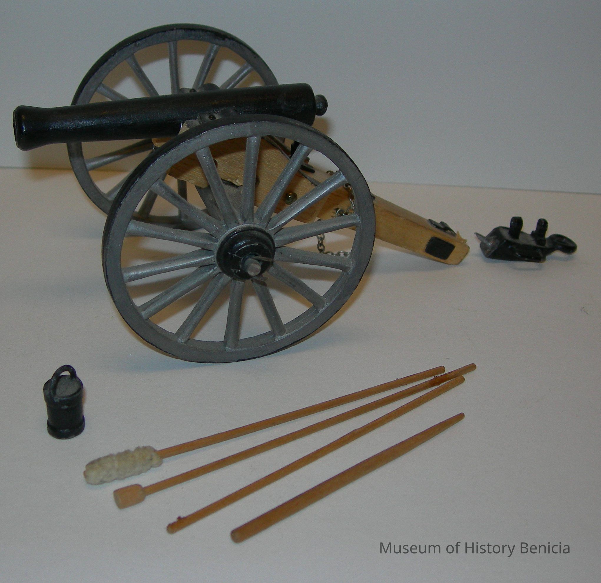 includes some small parts: the metal trailer hitch which is unattached from the end of the wagon; 4 wooden sticks used for tamping and to swab out the cannon barrell; and a pail with handle to hold liquid for cleaning the cannonCollection