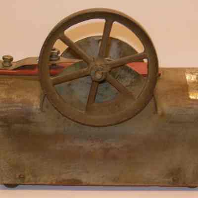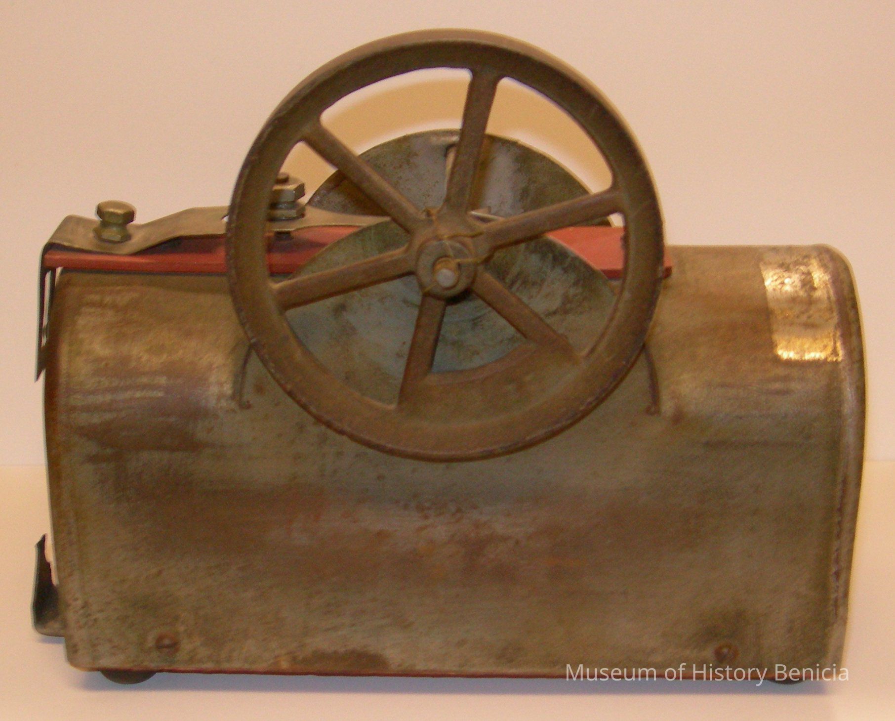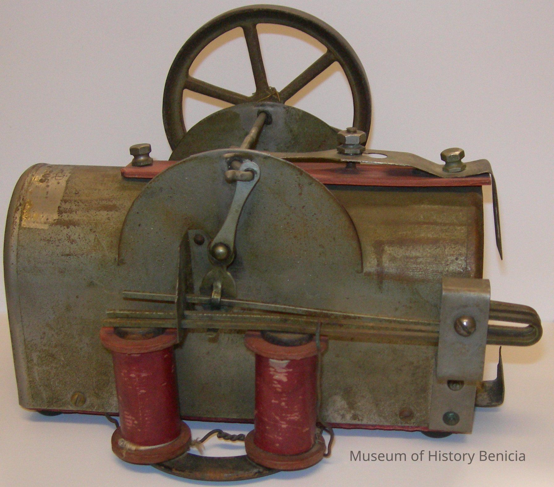 Mailbox shaped metal piece stamped "Pantented Sept. 5, 1905" with red painted wood base; two red wood spools on side with metal bars that move up and down by a flywheel on opposite side. It could be some kind of engine.