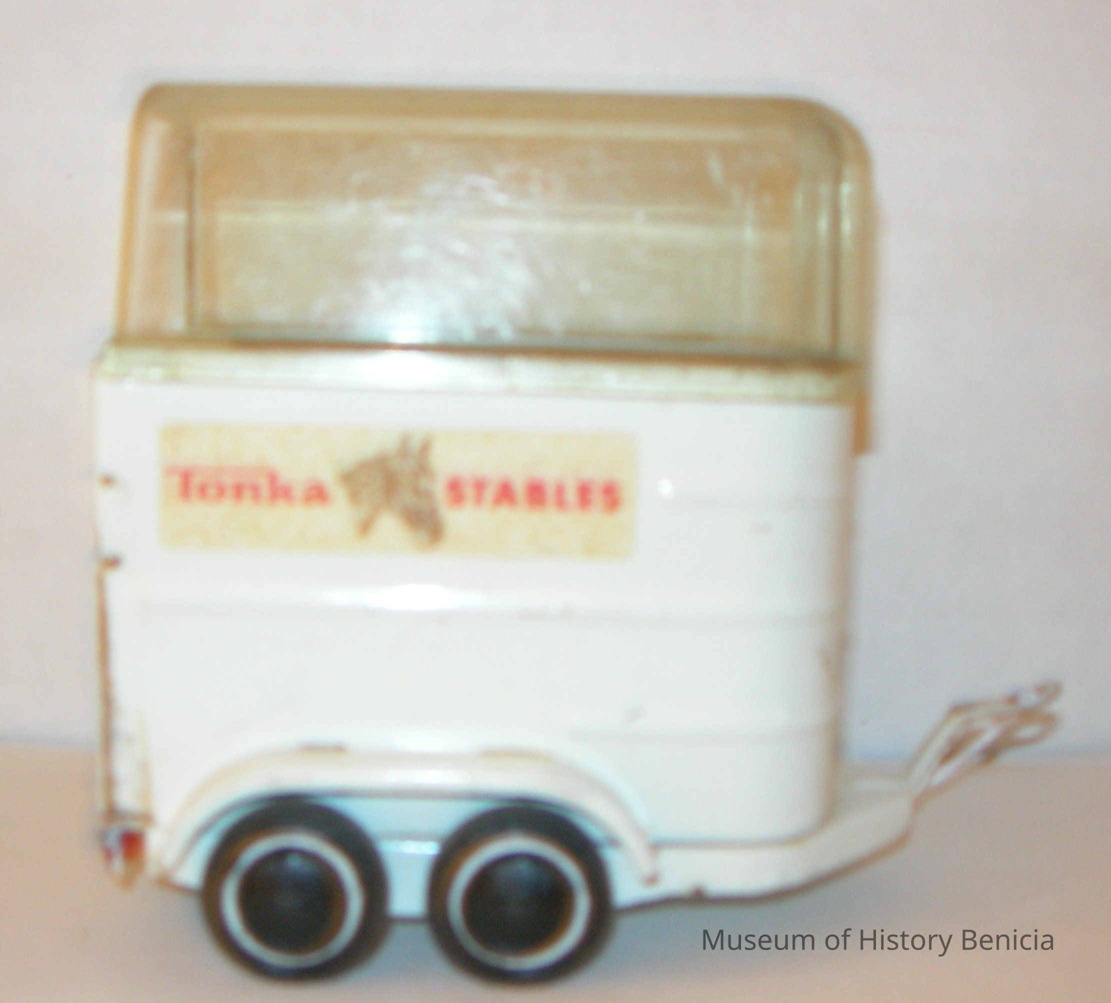 Tonka horse trailer, white lower area, clear plastic top (can be removed) "Tonka Stables" with a horse head logo decals both sides, four plastic tires