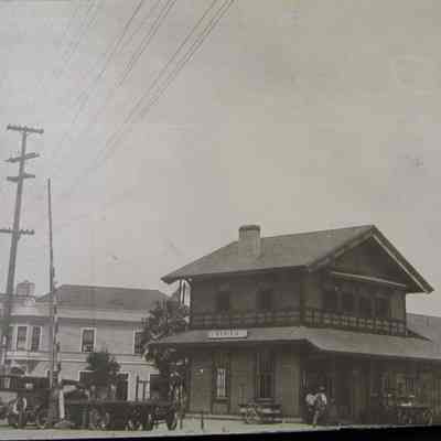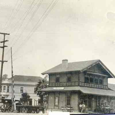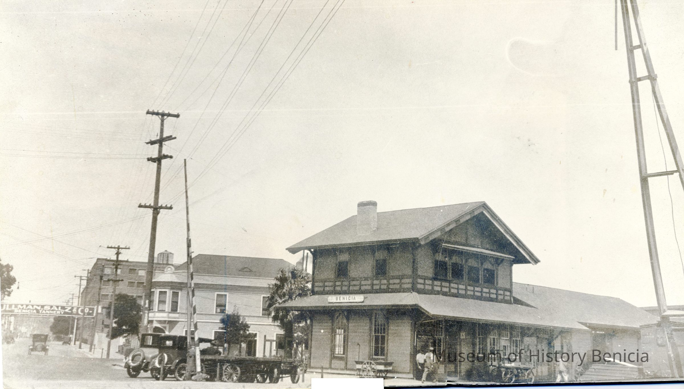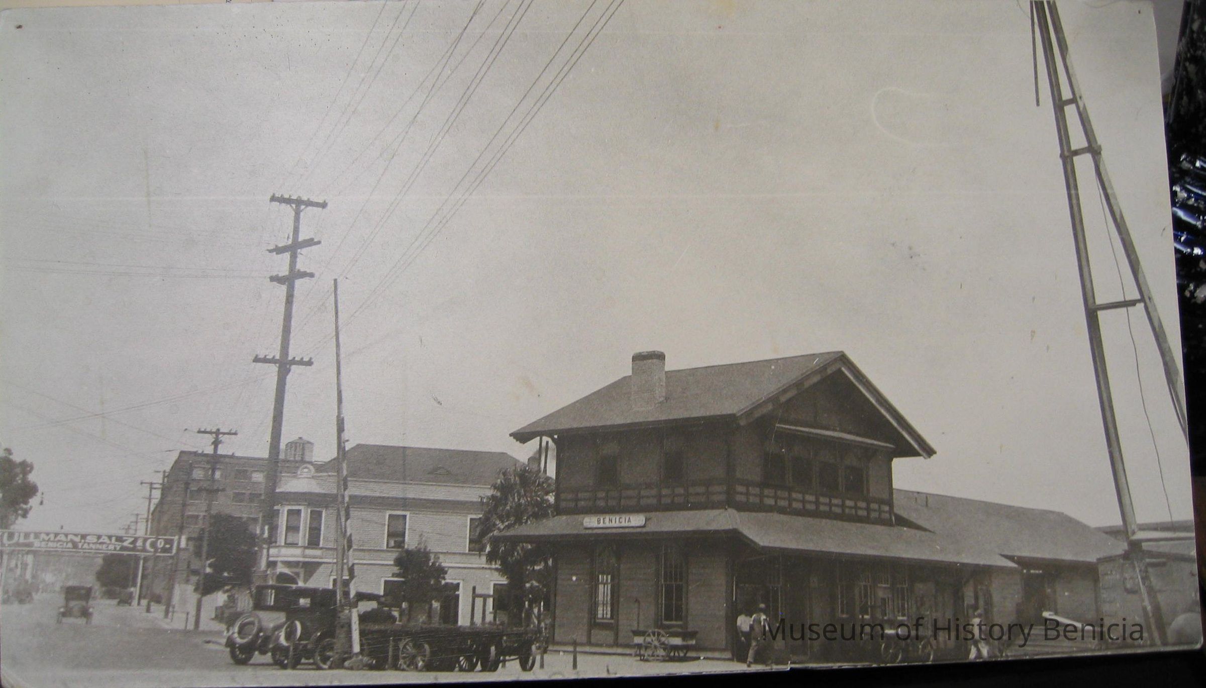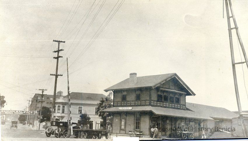 B/W photograph of the Benicia Train Depot at the bottom of First Street with the Lido/Jurgensen's Saloon and Kulman Salz & Co. sign to the left.Collection