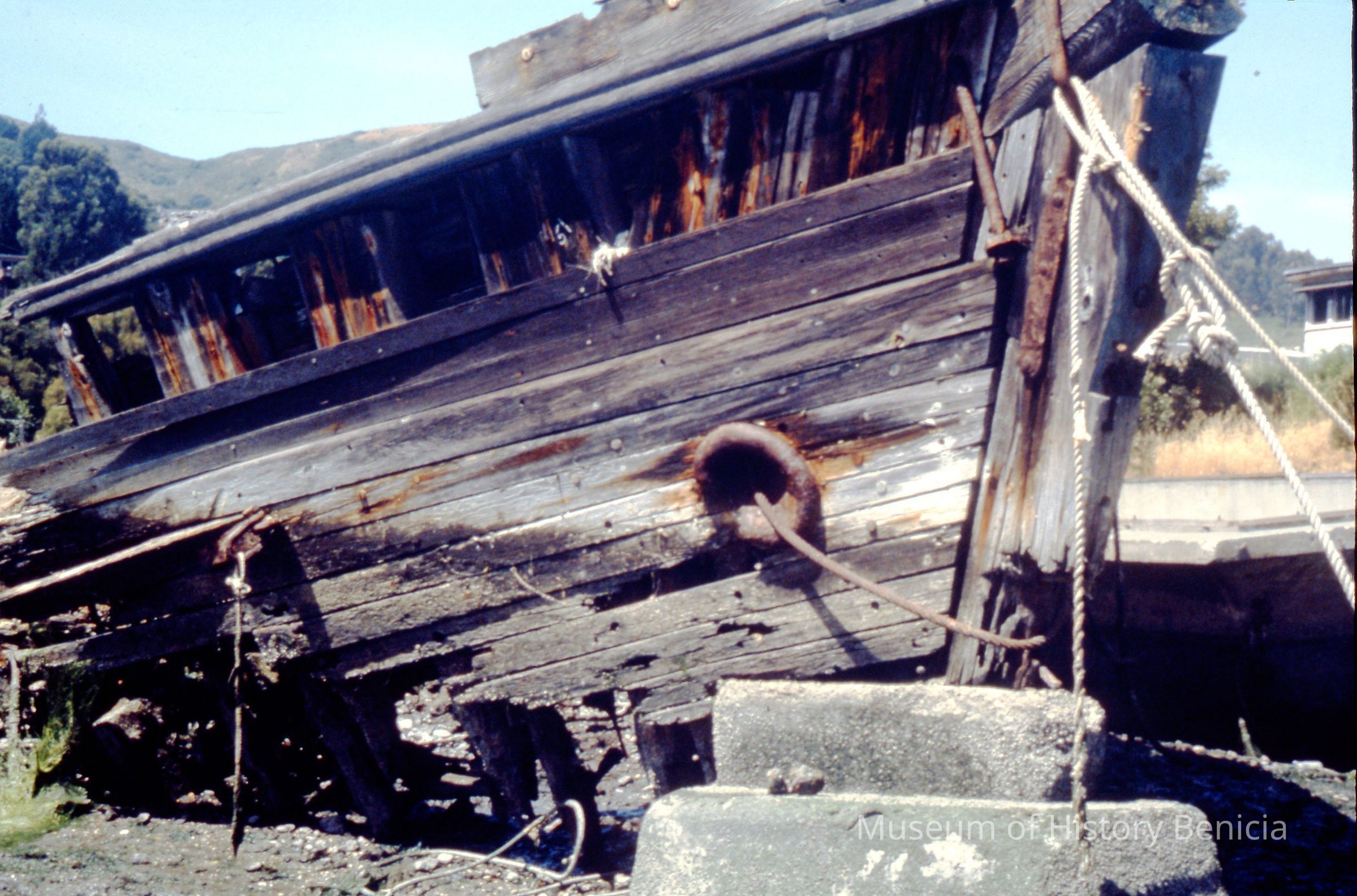 Excavation of the bow of the Brigantine "Galilee" in Sausalito and bringing it to Benicia. Linda Temple, City Council member, organized the project and Joe Garske Sr. transported the bow by barge. Brought to Benicia Maintenance Yard.Collection